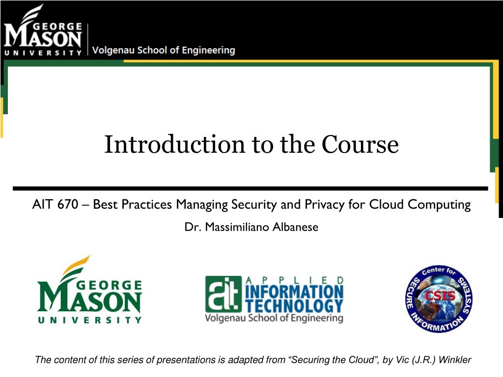 Introduction to the Course AIT 670 Best Practices Managing Security and Privacy for Cloud Computing Dr. Massimiliano Albanese The content of this series of presentations is adapted from Securing the Cloud , by Vic (J.R.) Winkler