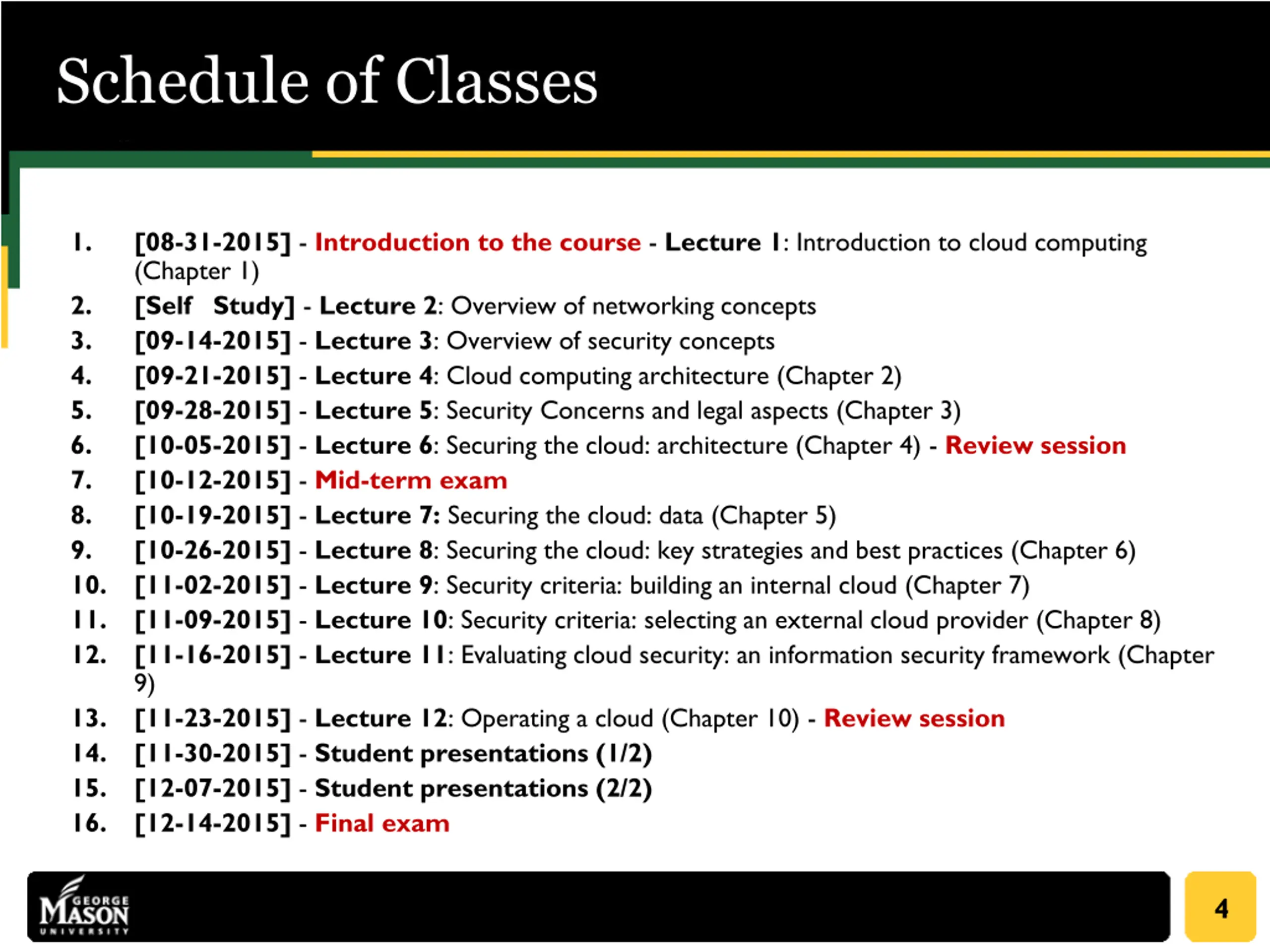 Schedule of Classes 1. [08-31-2015] - Introduction to the course - Lecture 1: Introduction to cloud computing (Chapter 1) [Self Study] - Lecture 2: Overview of networking concepts [09-14-2015] - Lecture 3: Overview of security concepts [09-21-2015] - Lecture 4: Cloud computing architecture (Chapter 2) [09-28-2015] - Lecture 5: Security Concerns and legal aspects (Chapter 3) [10-05-2015] - Lecture 6: Securing the cloud: architecture (Chapter 4) - Review session [10-12-2015] - Mid-term exam [10-19-2015] - Lecture 7: Securing the cloud: data (Chapter 5) [10-26-2015] - Lecture 8: Securing the cloud: key strategies and best practices (Chapter 6) [11-02-2015] - Lecture 9: Security criteria: building an internal cloud (Chapter 7) [11-09-2015] - Lecture 10: Security criteria: selecting an external cloud provider (Chapter 8) [11-16-2015] - Lecture 11: Evaluating cloud security: an information security framework (Chapter 9) [11-23-2015] - Lecture 12: Operating a cloud (Chapter 10) - Review session [11-30-2015] - Student presentations (1/2) [12-07-2015] - Student presentations (2/2) [12-14-2015] - Final exam 2. 3. 4. 5. 6. 7. 8. 9. 10. 11. 12. 13. 14. 15. 16. 4