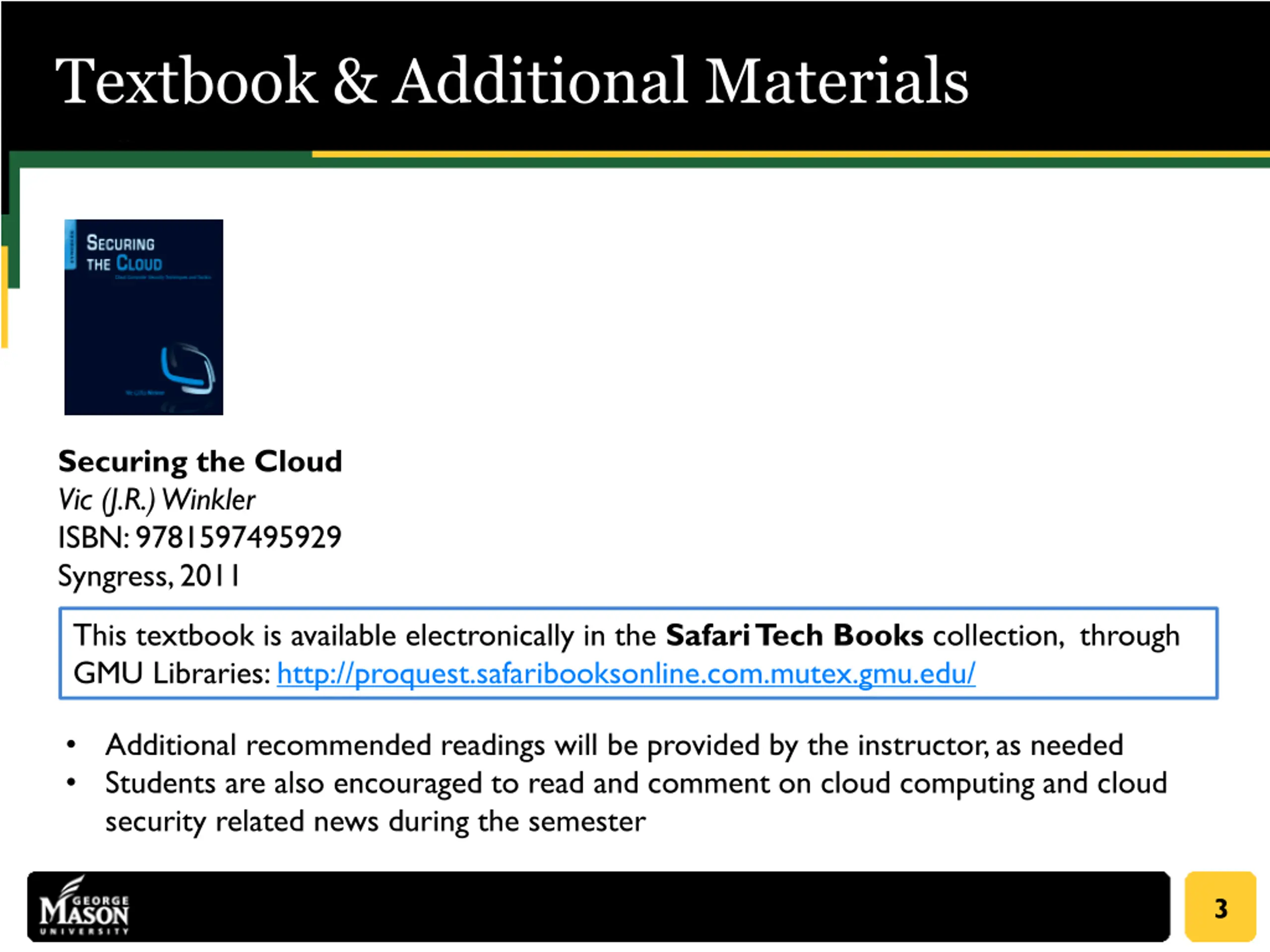 Textbook & Additional Materials Securing the Cloud Vic (J.R.) Winkler ISBN: 9781597495929 Syngress, 2011 This textbook is available electronically in the Safari Tech Books collection, through GMU Libraries: http://proquest.safaribooksonline.com.mutex.gmu.edu/ Additional recommended readings will be provided by the instructor, as needed Students are also encouraged to read and comment on cloud computing and cloud security related news during the semester 3