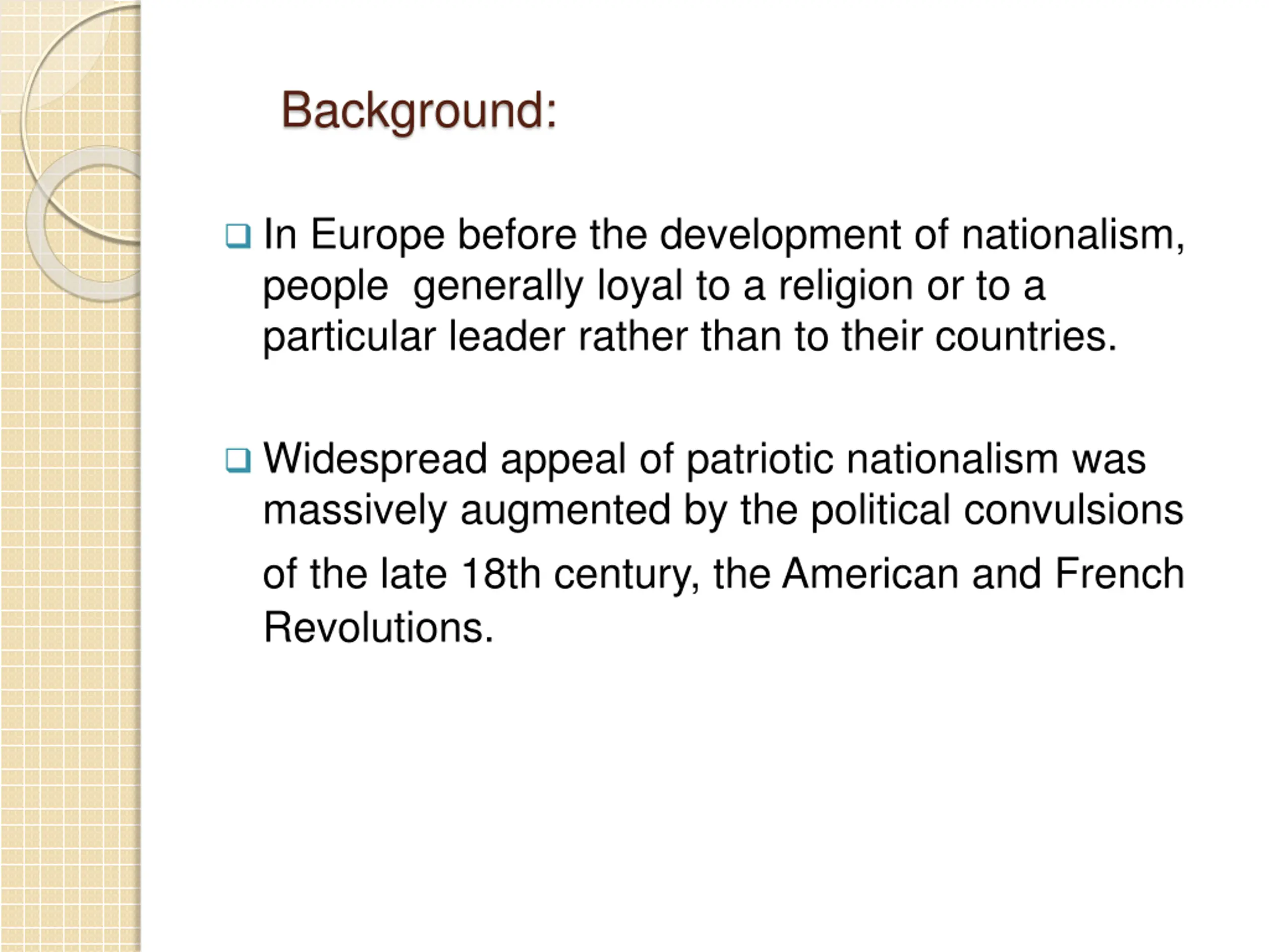 Background: In Europe before the development of nationalism, people generally loyal to a religion or to a particular leader rather than to their countries. Widespread appeal of patriotic nationalism was massively augmented by the political convulsions of the late 18th century, the American and French Revolutions.