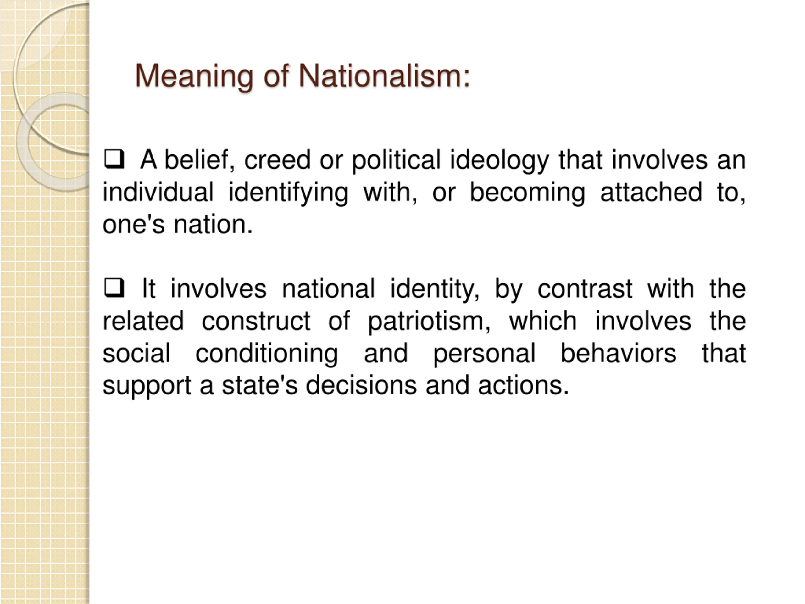 Meaning of Nationalism: A belief, creed or political ideology that involves an individual identifying with, or becoming attached to, one's nation. It involves national identity, by contrast with the related construct of patriotism, which involves the social conditioning and personal behaviors that support a state's decisions and actions.