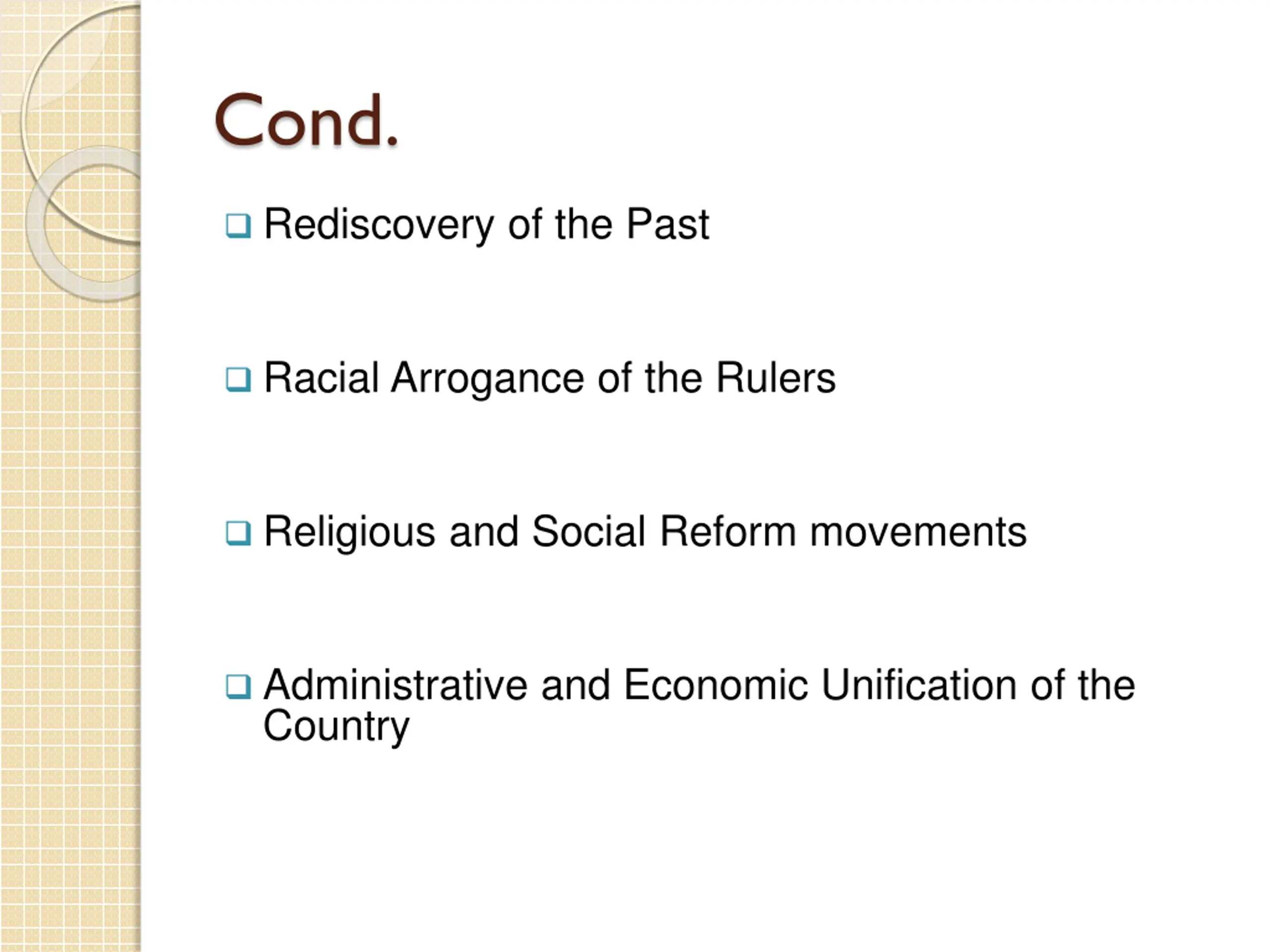 Cond. Rediscovery of the Past Racial Arrogance of the Rulers Religious and Social Reform movements Administrative and Economic Unification of the Country