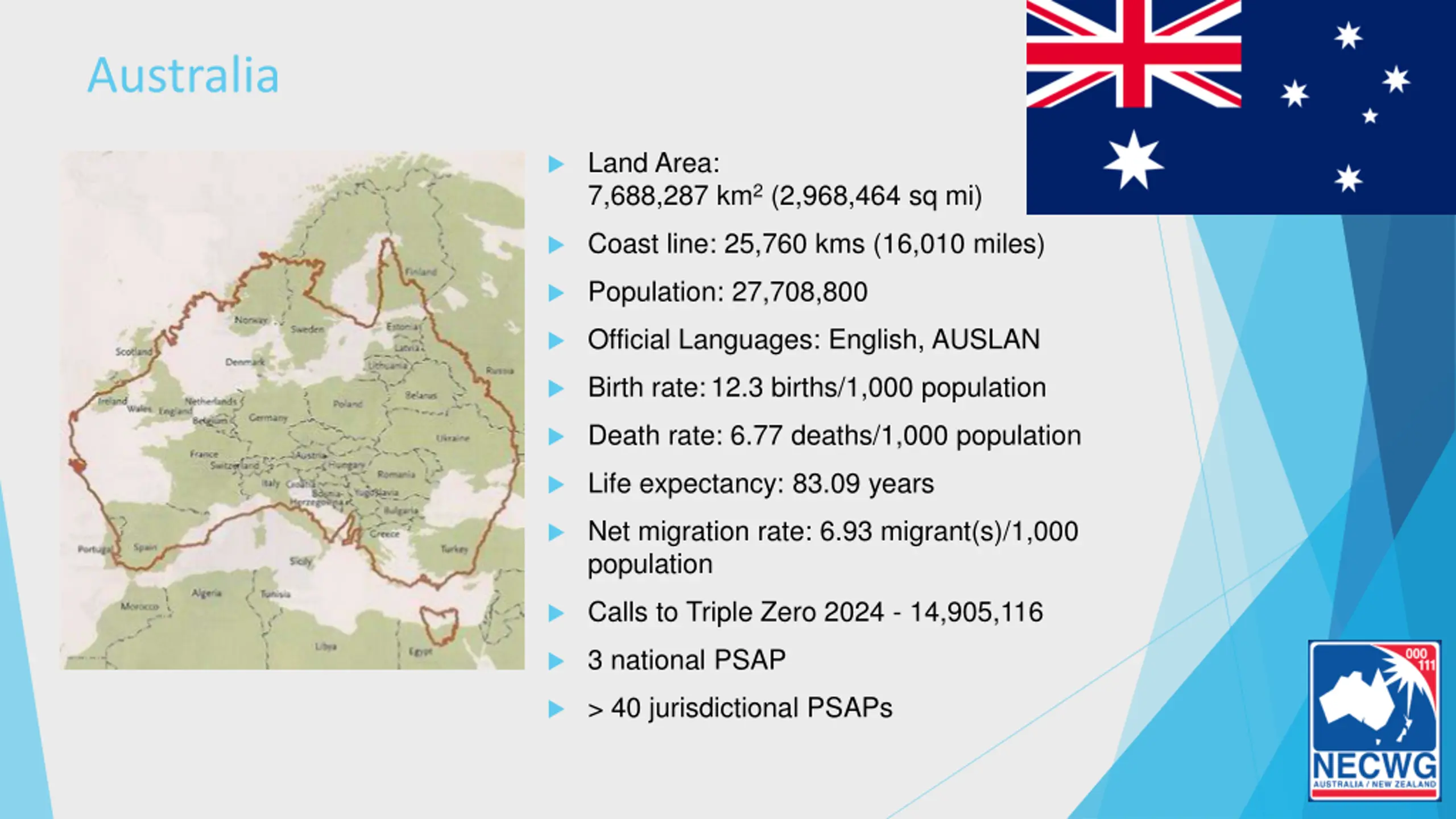 Australia Land Area: 7,688,287 km2(2,968,464 sq mi) Coast line: 25,760 kms (16,010 miles) Population: 27,708,800 Official Languages: English, AUSLAN Birth rate:12.3 births/1,000 population Death rate: 6.77 deaths/1,000 population Life expectancy: 83.09 years Net migration rate: 6.93 migrant(s)/1,000 population Calls to Triple Zero 2024 - 14,905,116 3 national PSAP > 40 jurisdictional PSAPs