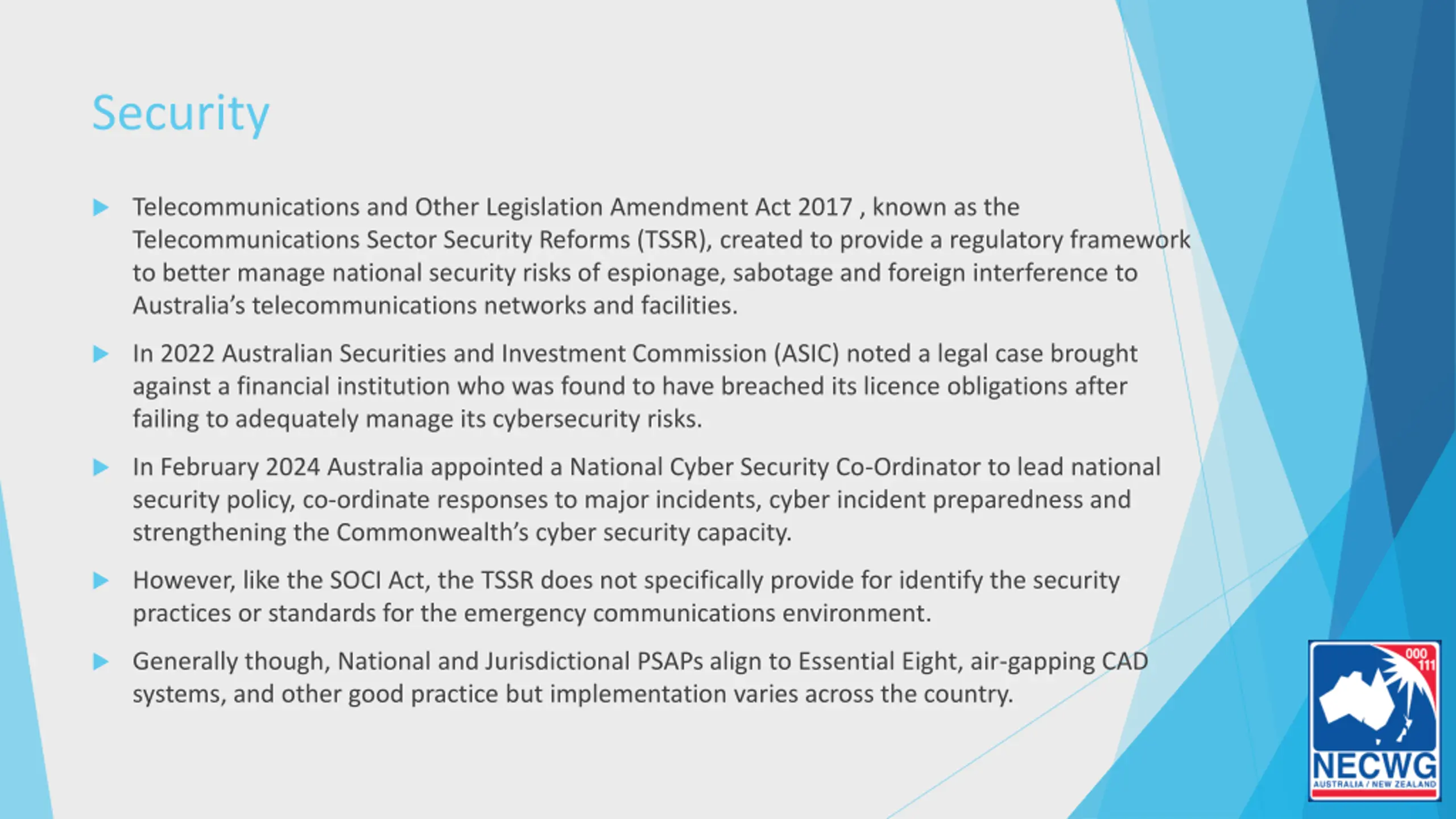 Security Telecommunications and Other Legislation Amendment Act 2017 , known as the Telecommunications Sector Security Reforms (TSSR), created to provide a regulatory framework to better manage national security risks of espionage, sabotage and foreign interference to Australia s telecommunications networks and facilities. In 2022 Australian Securities and Investment Commission (ASIC) noted a legal case brought against a financial institution who was found to have breached its licence obligations after failing to adequately manage its cybersecurity risks. In February 2024 Australia appointed a National Cyber Security Co-Ordinator to lead national security policy, co-ordinate responses to major incidents, cyber incident preparedness and strengthening the Commonwealth s cyber security capacity. However, like the SOCI Act, the TSSR does not specifically provide for identify the security practices or standards for the emergency communications environment. Generally though, National and Jurisdictional PSAPs align to Essential Eight, air-gapping CAD systems, and other good practice but implementation varies across the country.