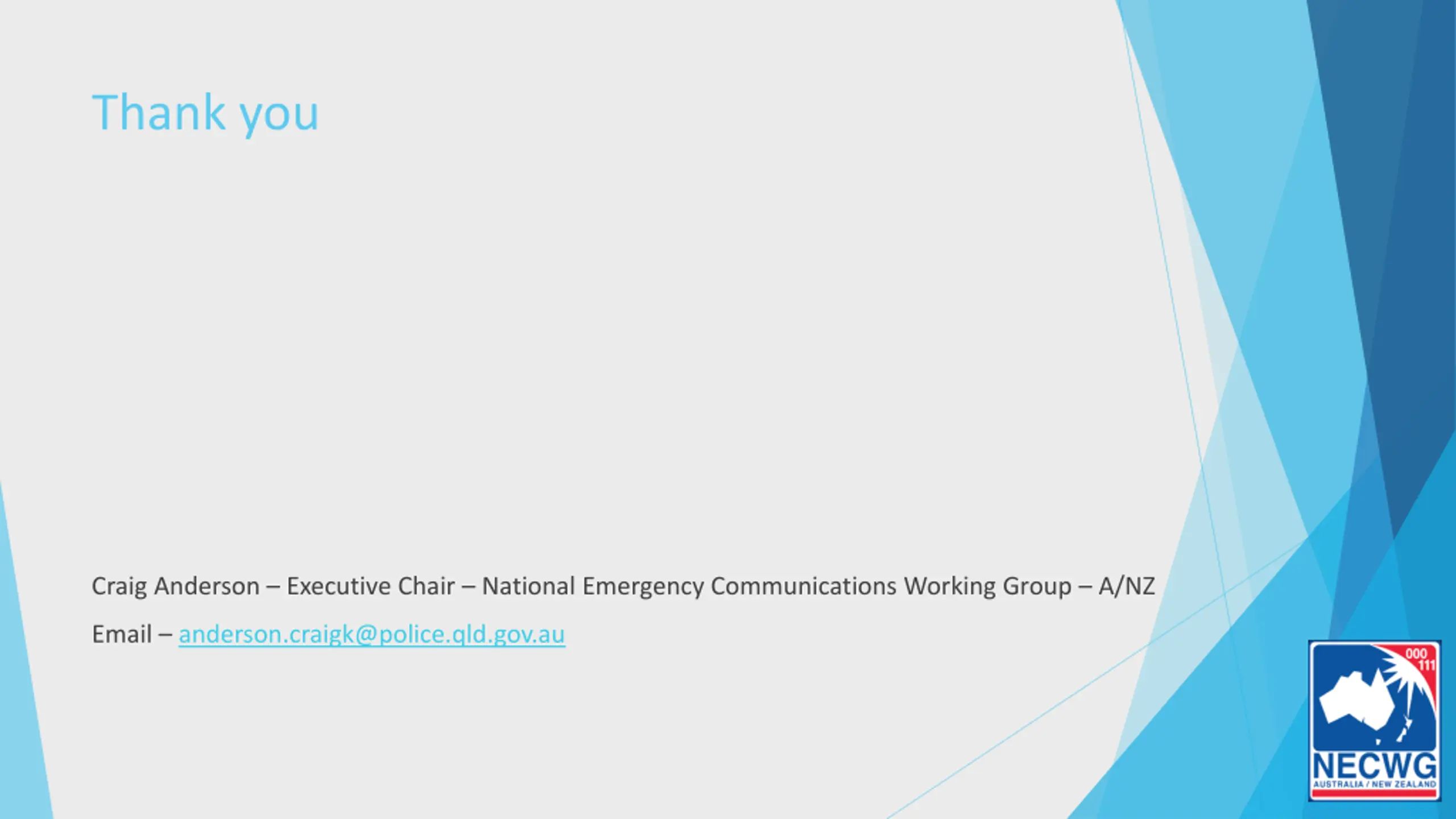 Thank you Craig Anderson Executive Chair National Emergency Communications Working Group A/NZ Email anderson.craigk@police.qld.gov.au