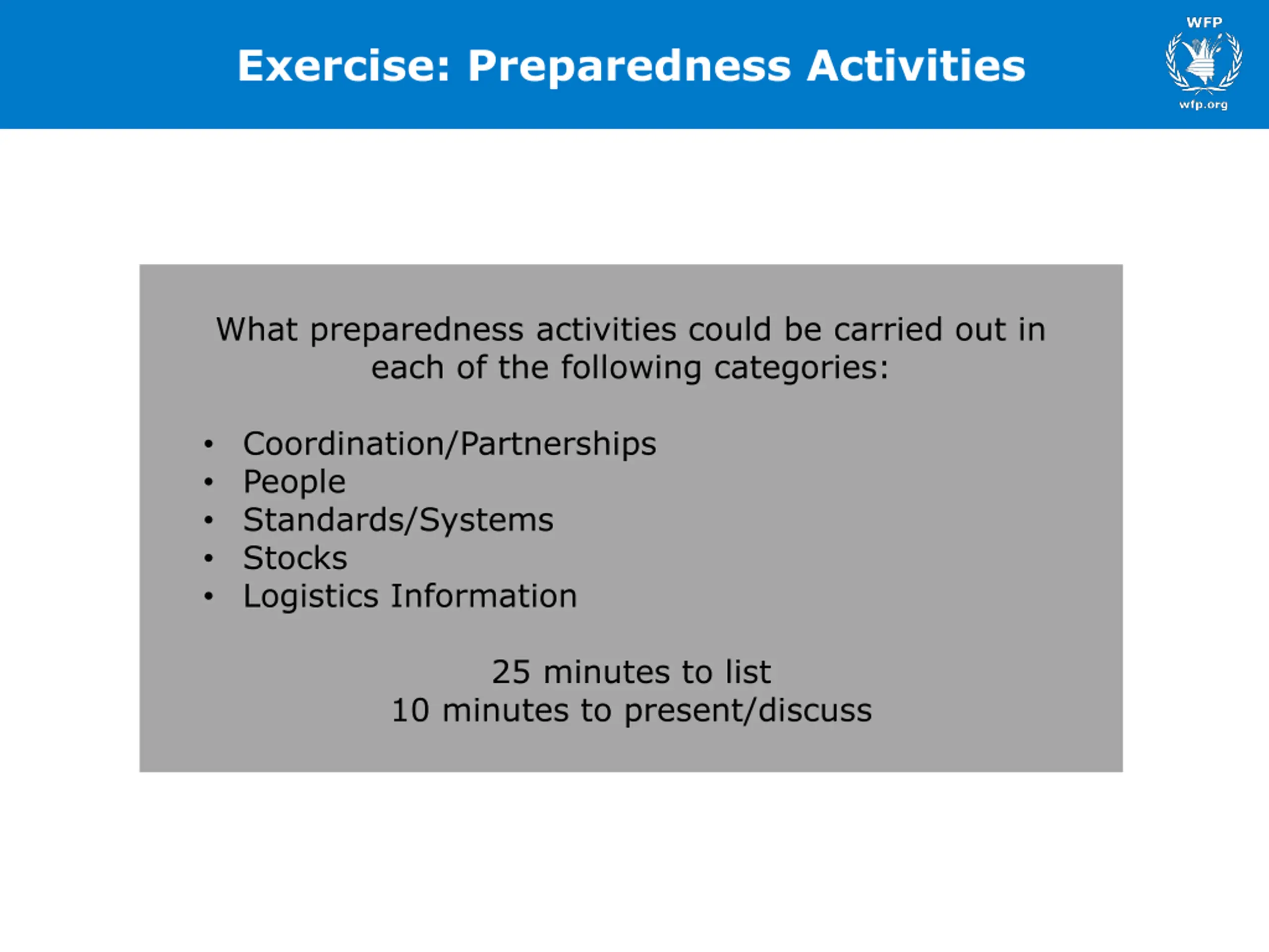 Exercise: Preparedness Activities What preparedness activities could be carried out in each of the following categories: Coordination/Partnerships People Standards/Systems Stocks Logistics Information 25 minutes to list 10 minutes to present/discuss