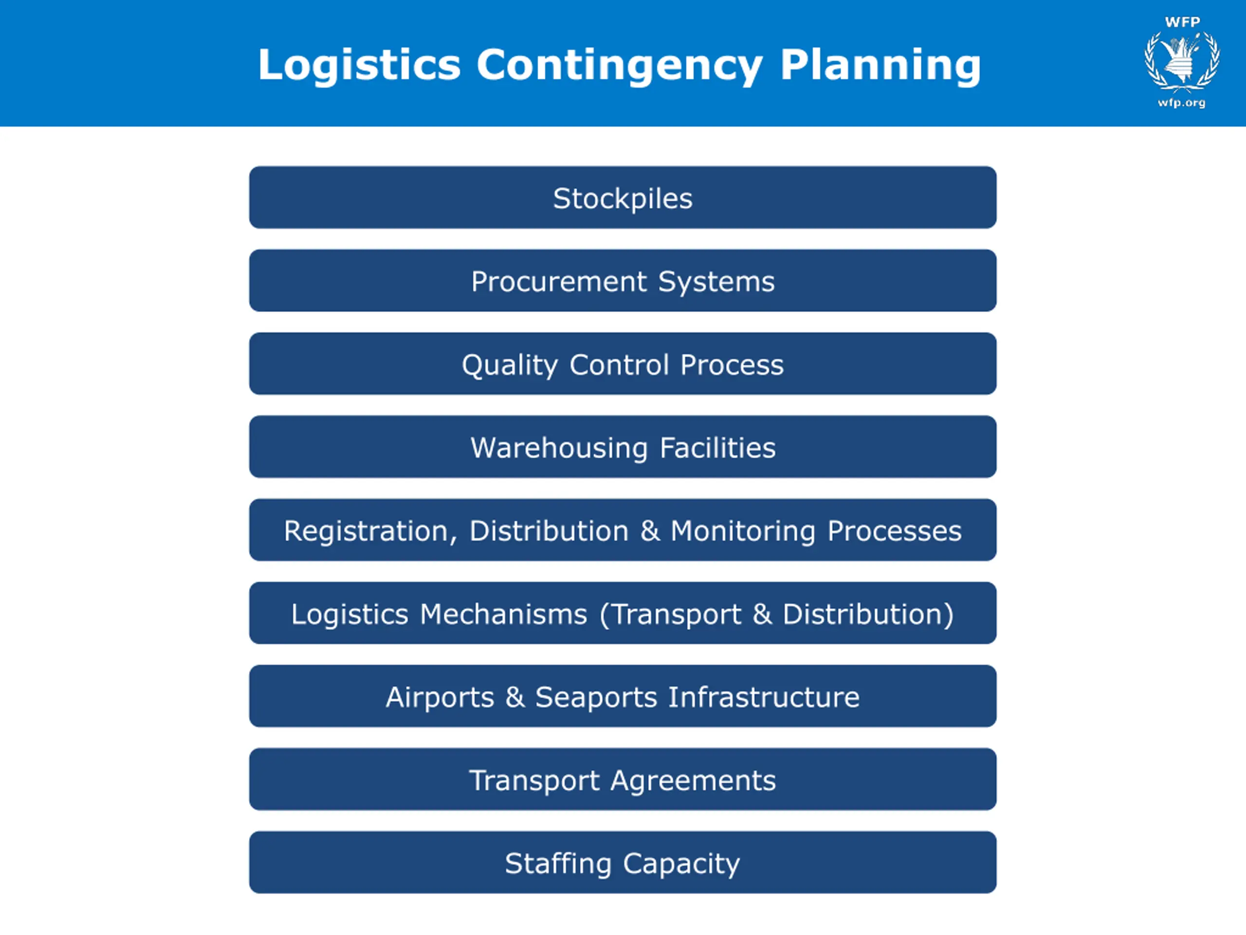 Logistics Contingency Planning Stockpiles Procurement Systems Quality Control Process Warehousing Facilities Registration, Distribution & Monitoring Processes Logistics Mechanisms (Transport & Distribution) Airports & Seaports Infrastructure Transport Agreements Staffing Capacity