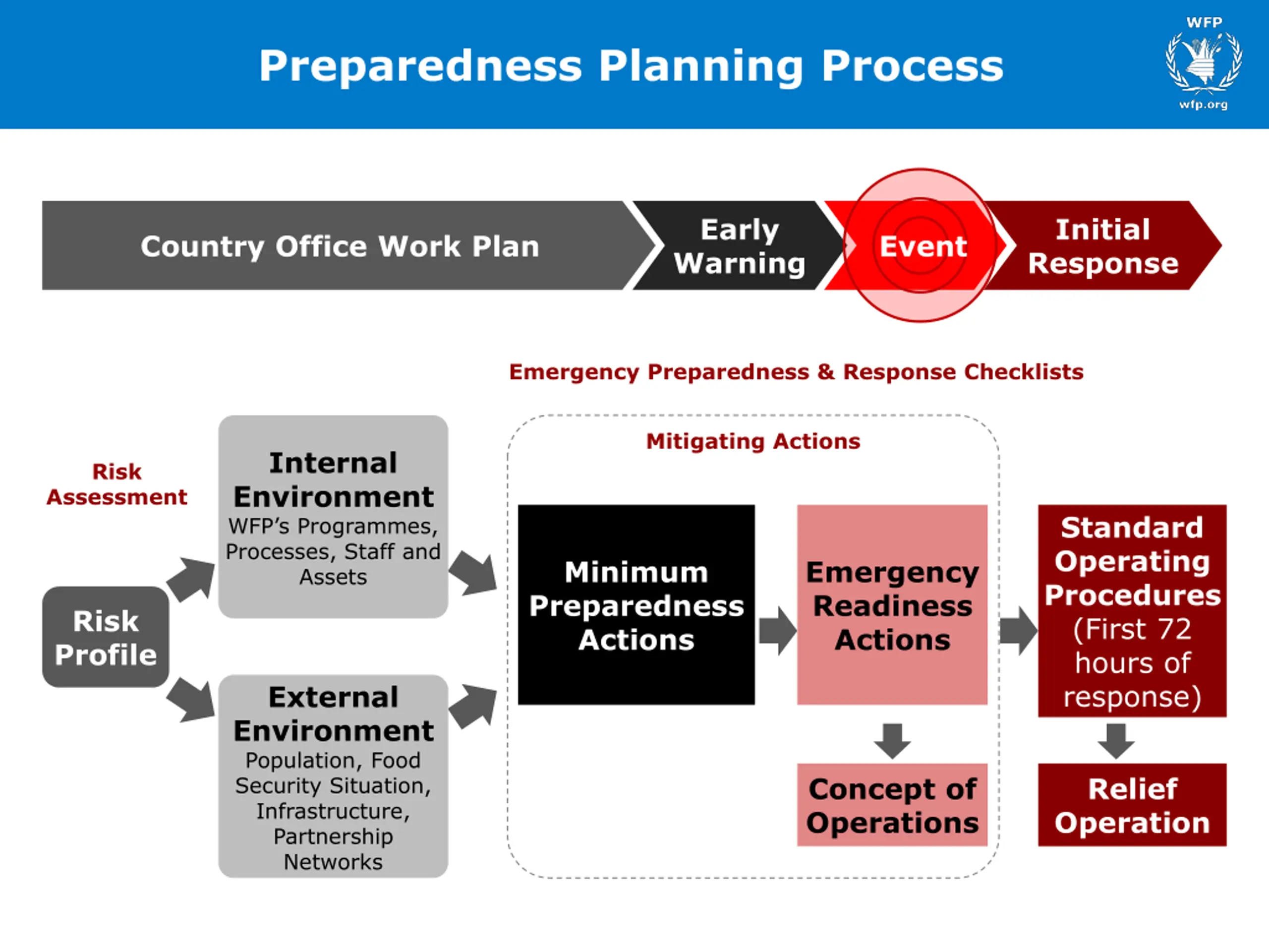 Preparedness Planning Process Early Warning Initial Response Country Office Work Plan Event Emergency Preparedness & Response Checklists Mitigating Actions Internal Environment WFP s Programmes, Processes, Staff and Assets Risk Assessment Standard Operating Procedures (First 72 hours of response) Minimum Preparedness Actions Emergency Readiness Actions Risk Profile External Environment Population, Food Security Situation, Infrastructure, Partnership Networks Concept of Operations Relief Operation