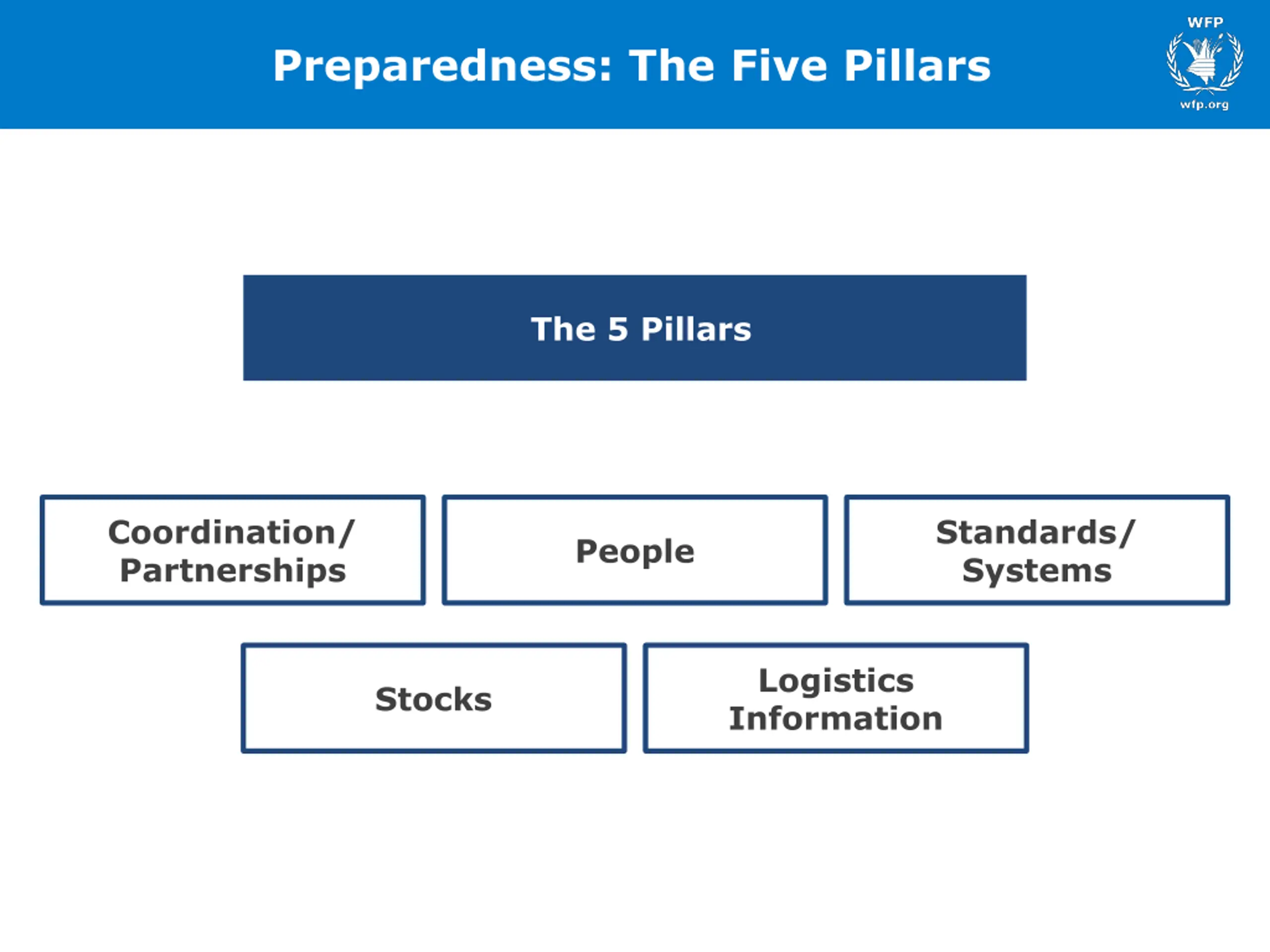Preparedness: The Five Pillars The 5 Pillars Coordination/ Partnerships Standards/ Systems People Logistics Information Stocks