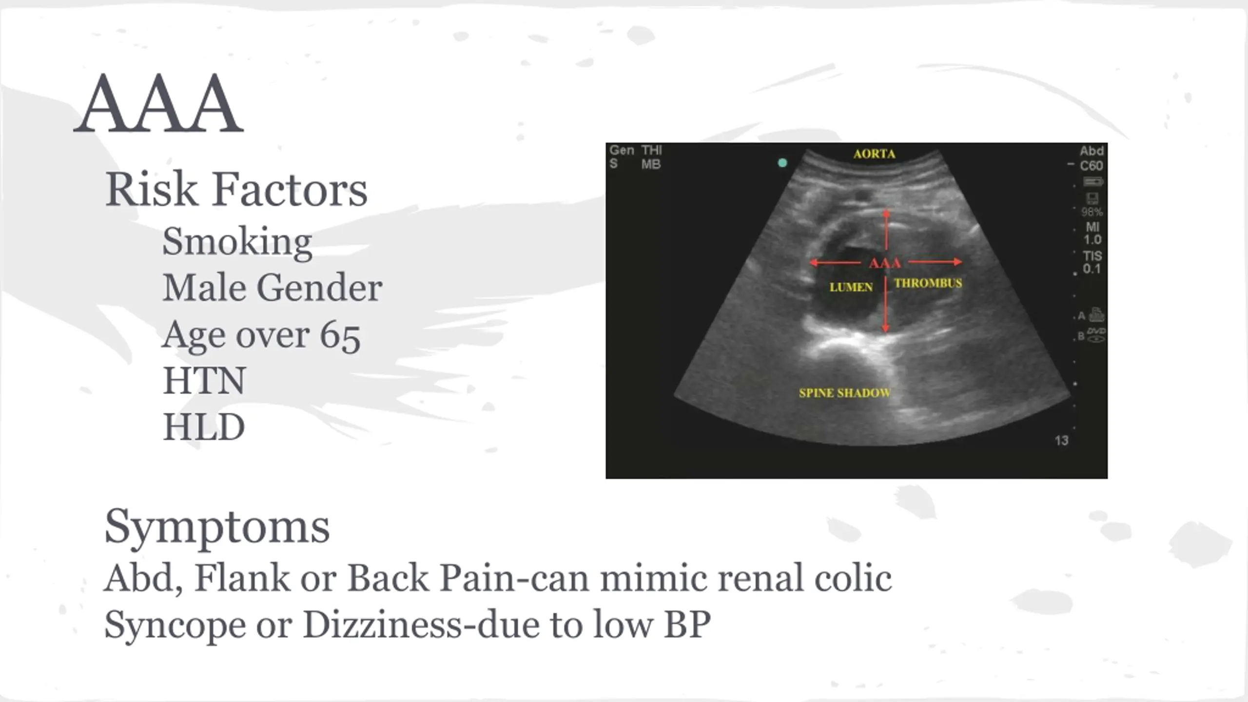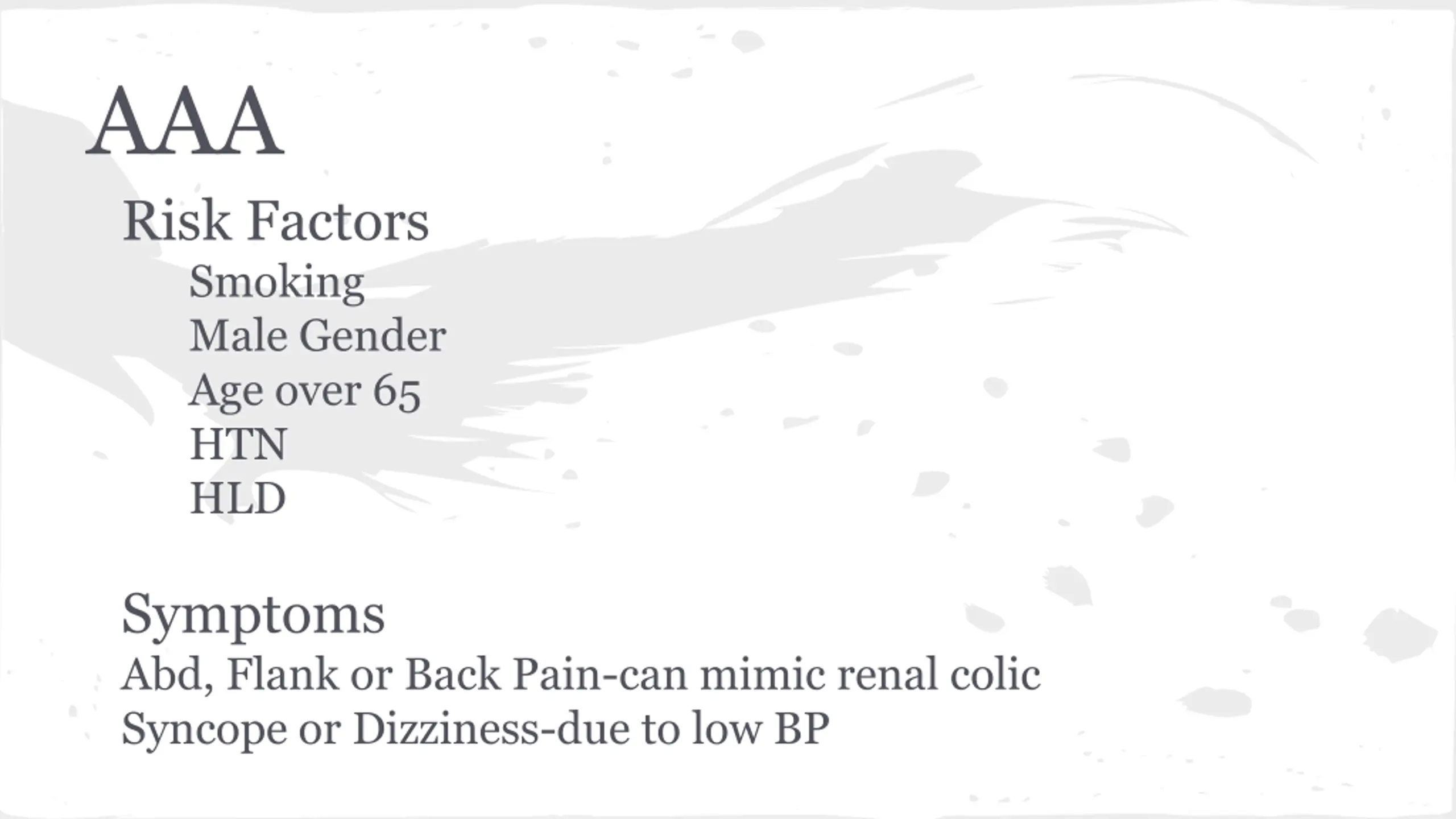 AAA Risk Factors Smoking Male Gender Age over 65 HTN HLD Symptoms Abd, Flank or Back Pain-can mimic renal colic Syncope or Dizziness-due to low BP