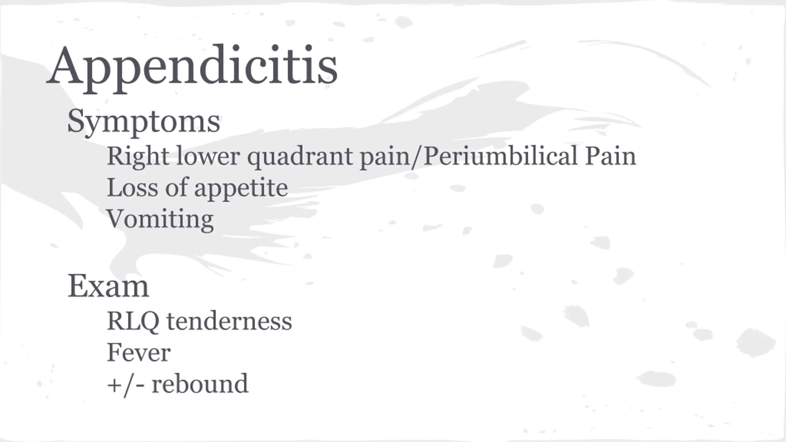 Appendicitis Symptoms Right lower quadrant pain/Periumbilical Pain Loss of appetite Vomiting Exam RLQ tenderness Fever +/- rebound