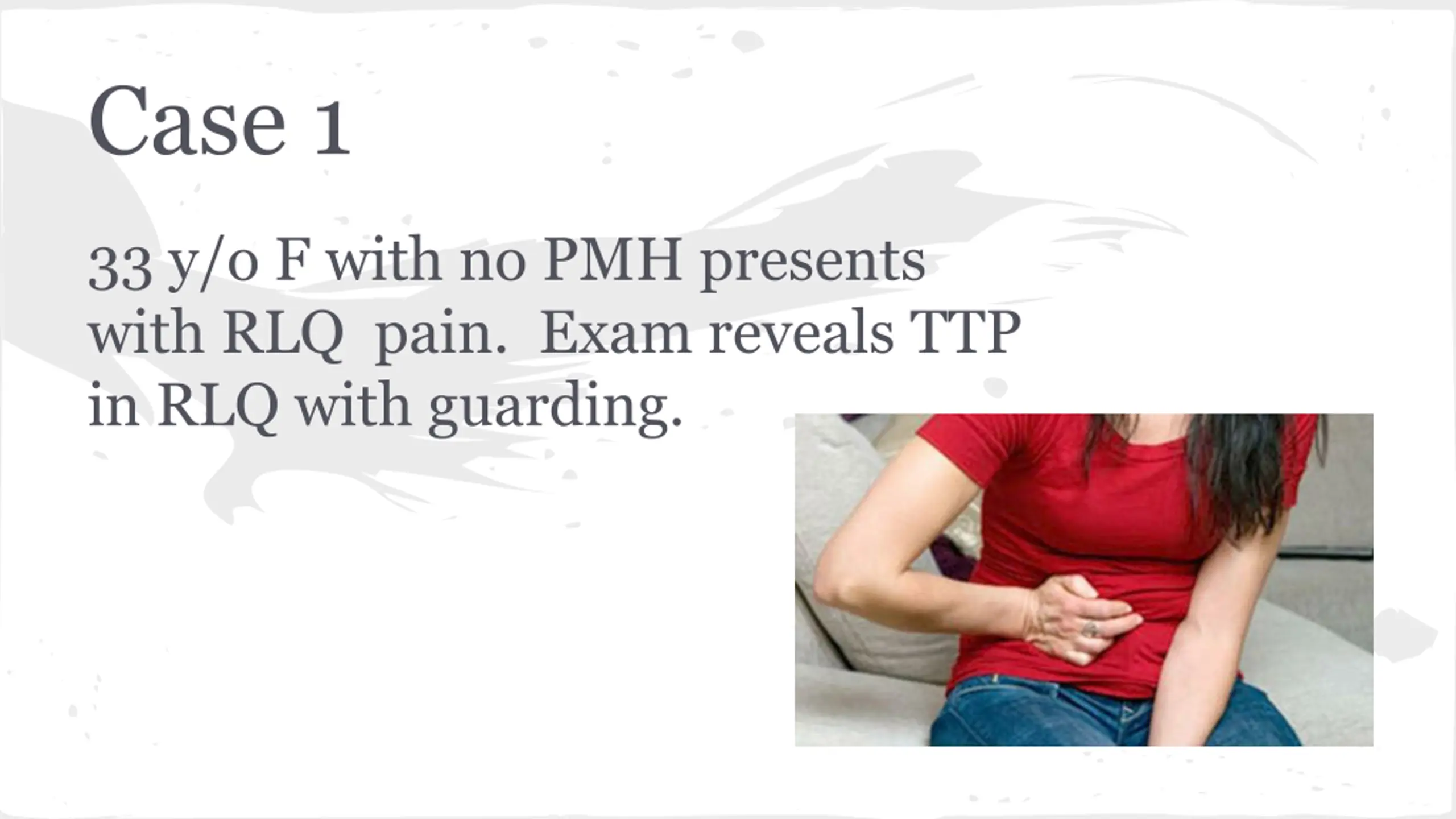 Case 1 33 y/o F with no PMH presents with RLQ pain. Exam reveals TTP in RLQ with guarding.