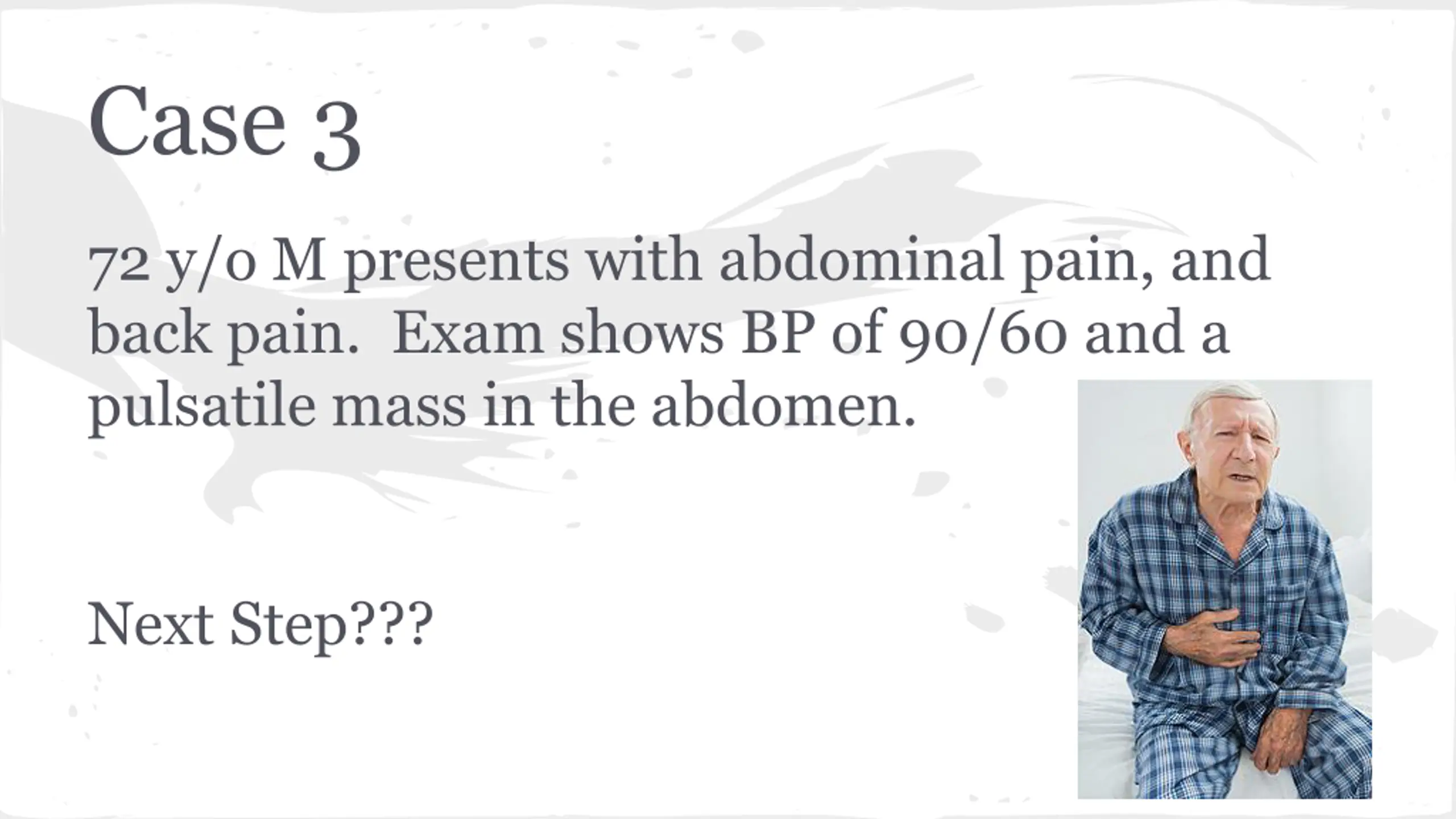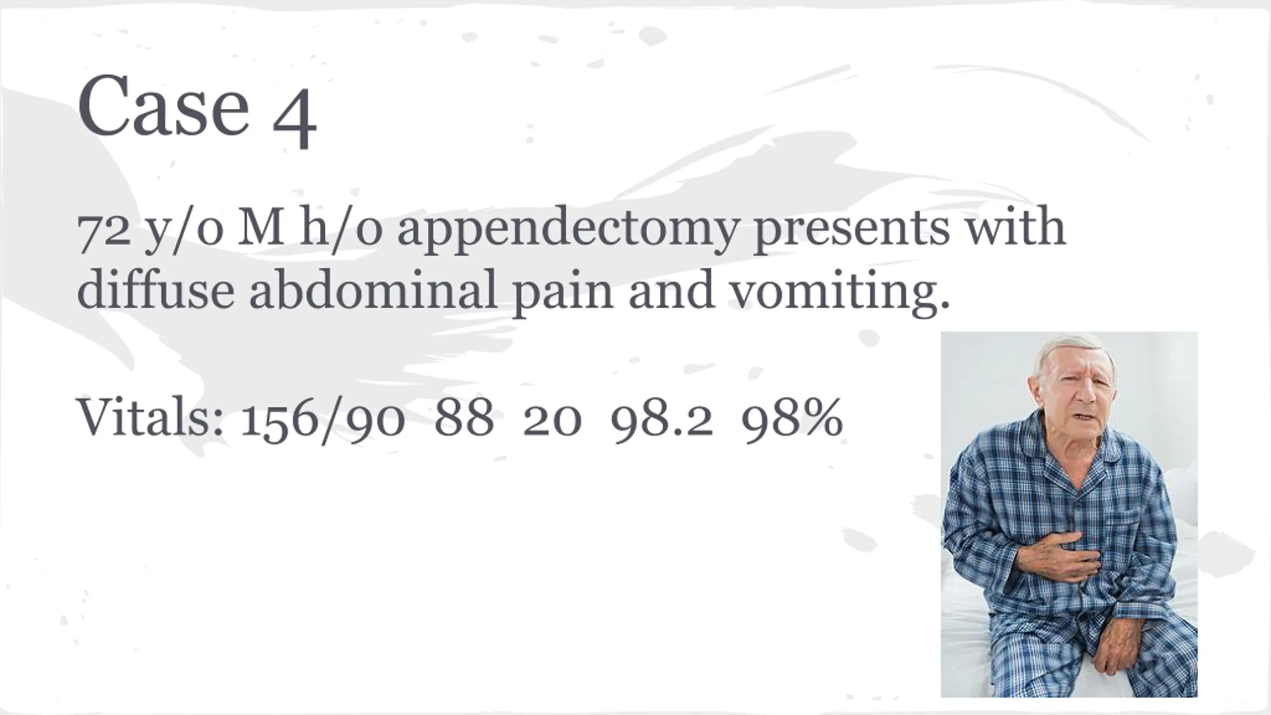 Case 4 72 y/o M h/o appendectomy presents with diffuse abdominal pain and vomiting. Vitals: 156/90 88 20 98.2 98%
