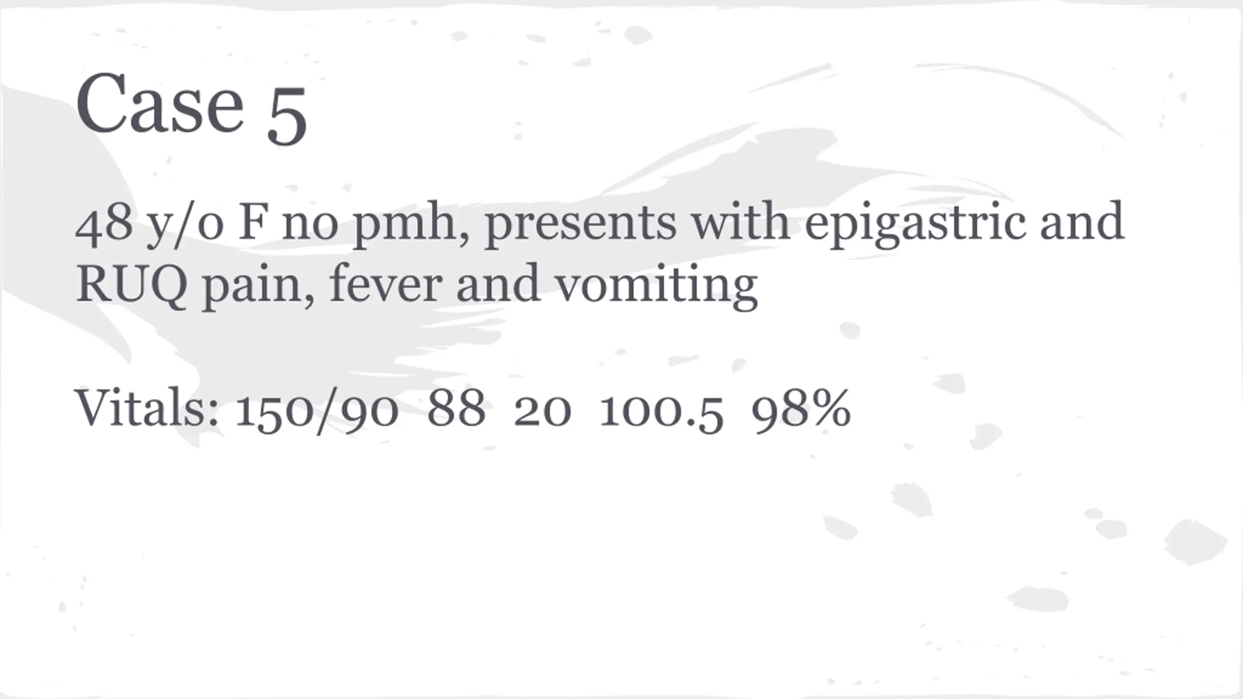 Case 5 48 y/o F no pmh, presents with epigastric and RUQ pain, fever and vomiting Vitals: 150/90 88 20 100.5 98%