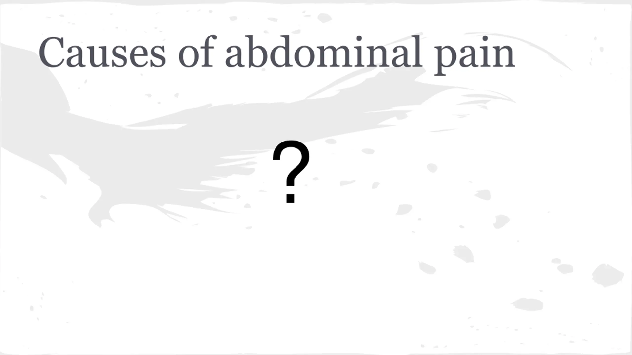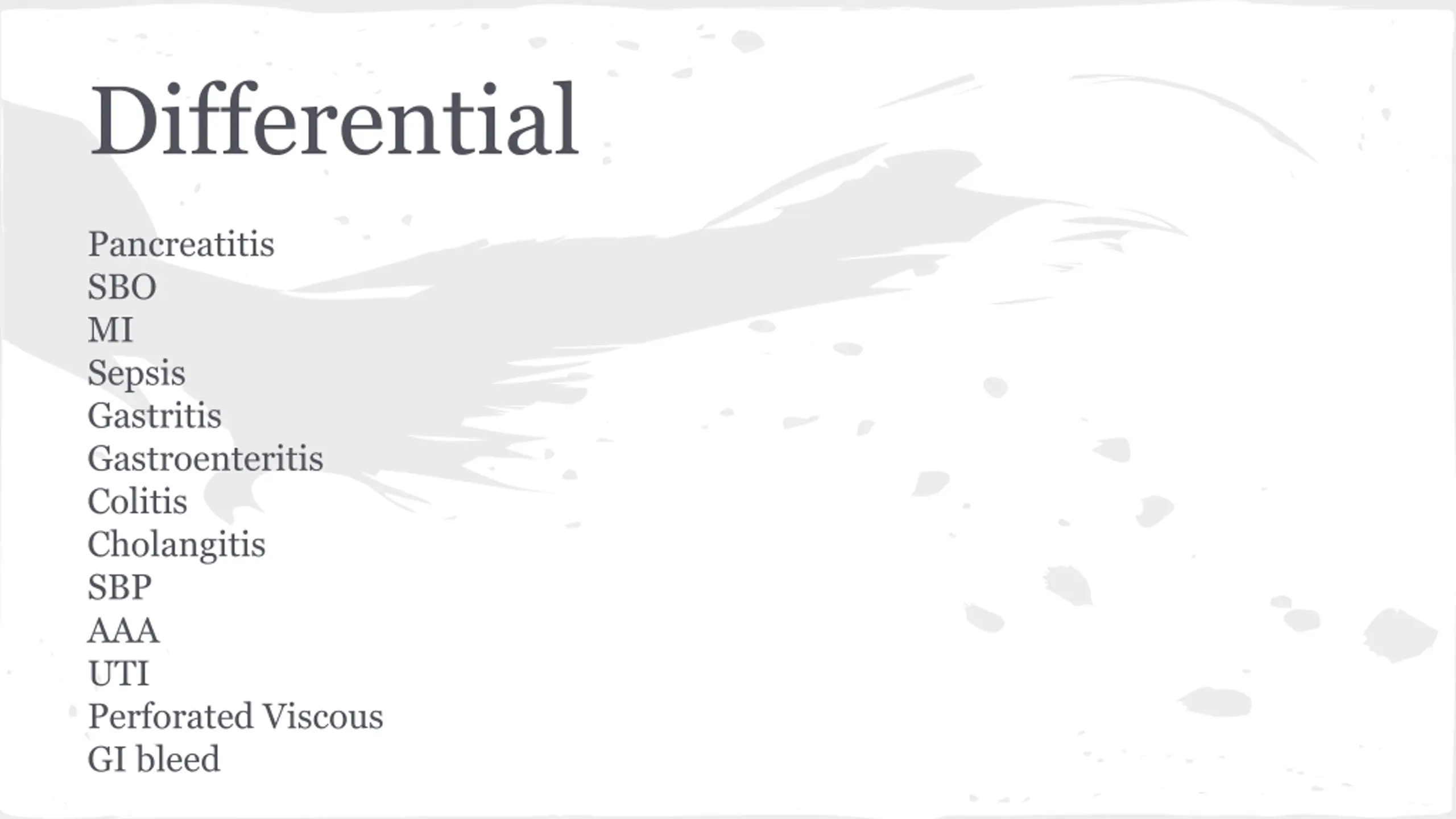 Differential Pancreatitis SBO MI Sepsis Gastritis Gastroenteritis Colitis Cholangitis SBP AAA UTI Perforated Viscous GI bleed