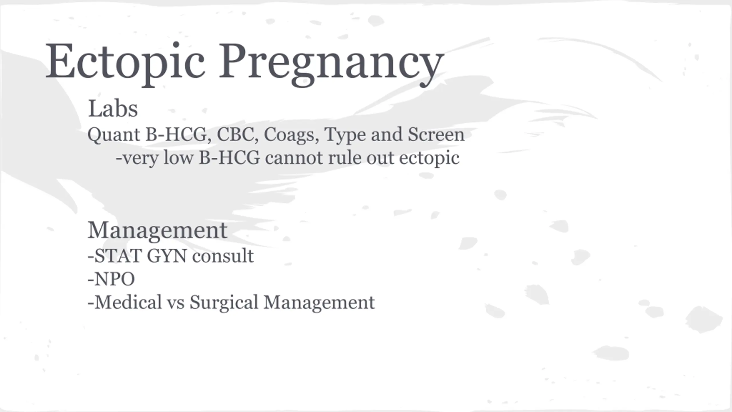 Ectopic Pregnancy Labs Quant B-HCG, CBC, Coags, Type and Screen -very low B-HCG cannot rule out ectopic Management -STAT GYN consult -NPO -Medical vs Surgical Management