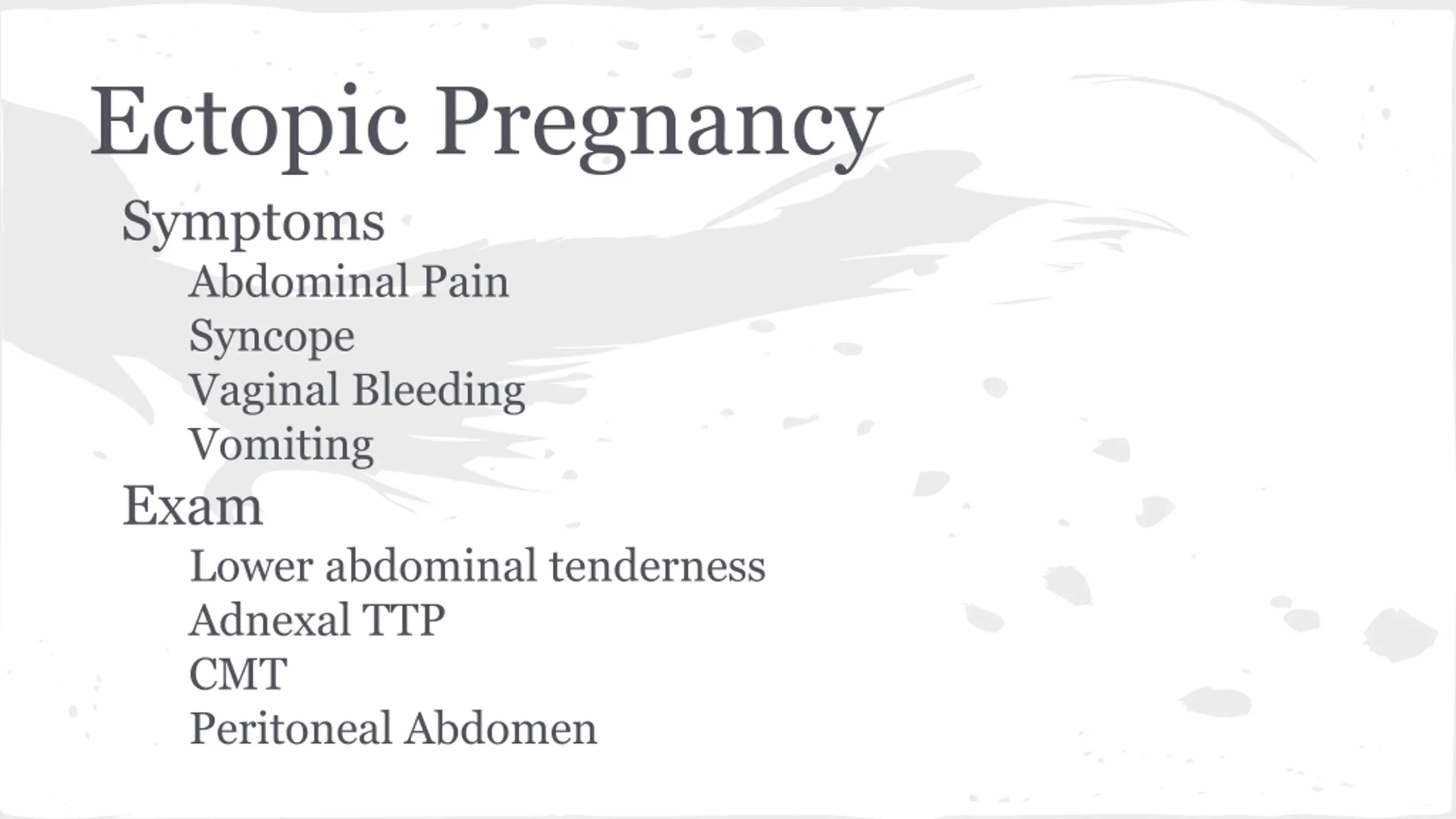 Ectopic Pregnancy Symptoms Abdominal Pain Syncope Vaginal Bleeding Vomiting Exam Lower abdominal tenderness Adnexal TTP CMT Peritoneal Abdomen