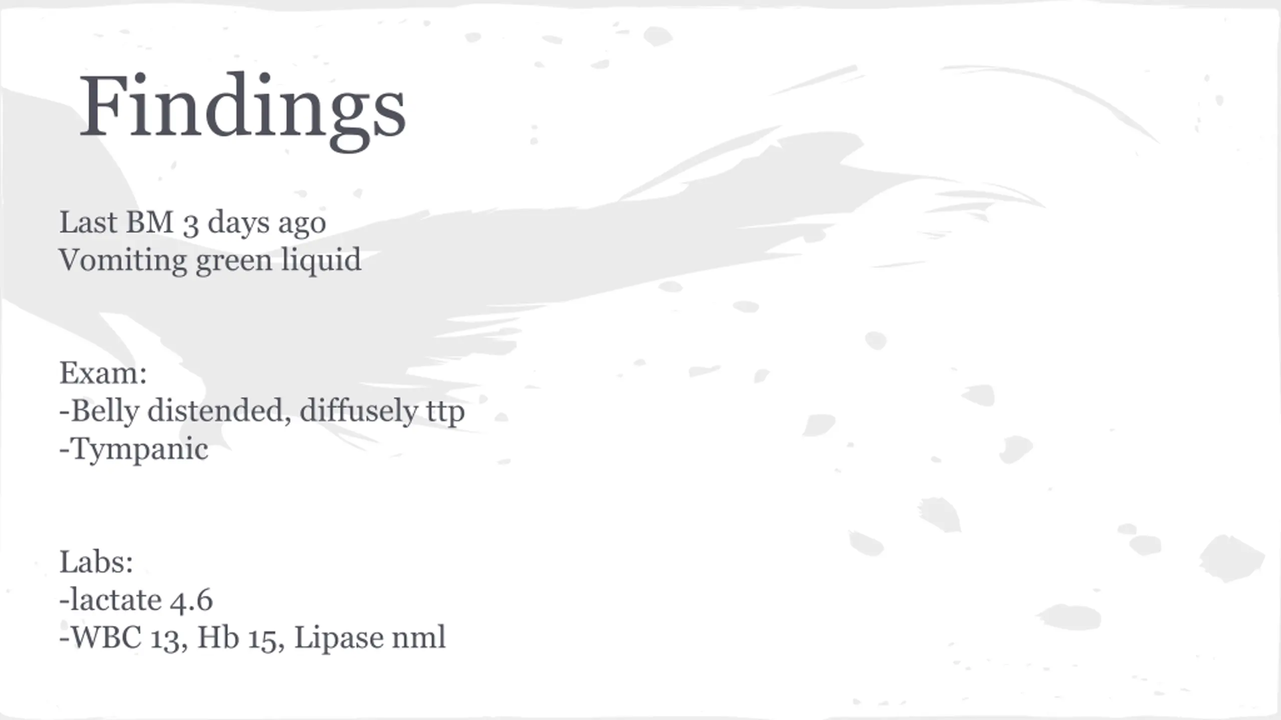 Findings Last BM 3 days ago Vomiting green liquid Exam: -Belly distended, diffusely ttp -Tympanic Labs: -lactate 4.6 -WBC 13, Hb 15, Lipase nml