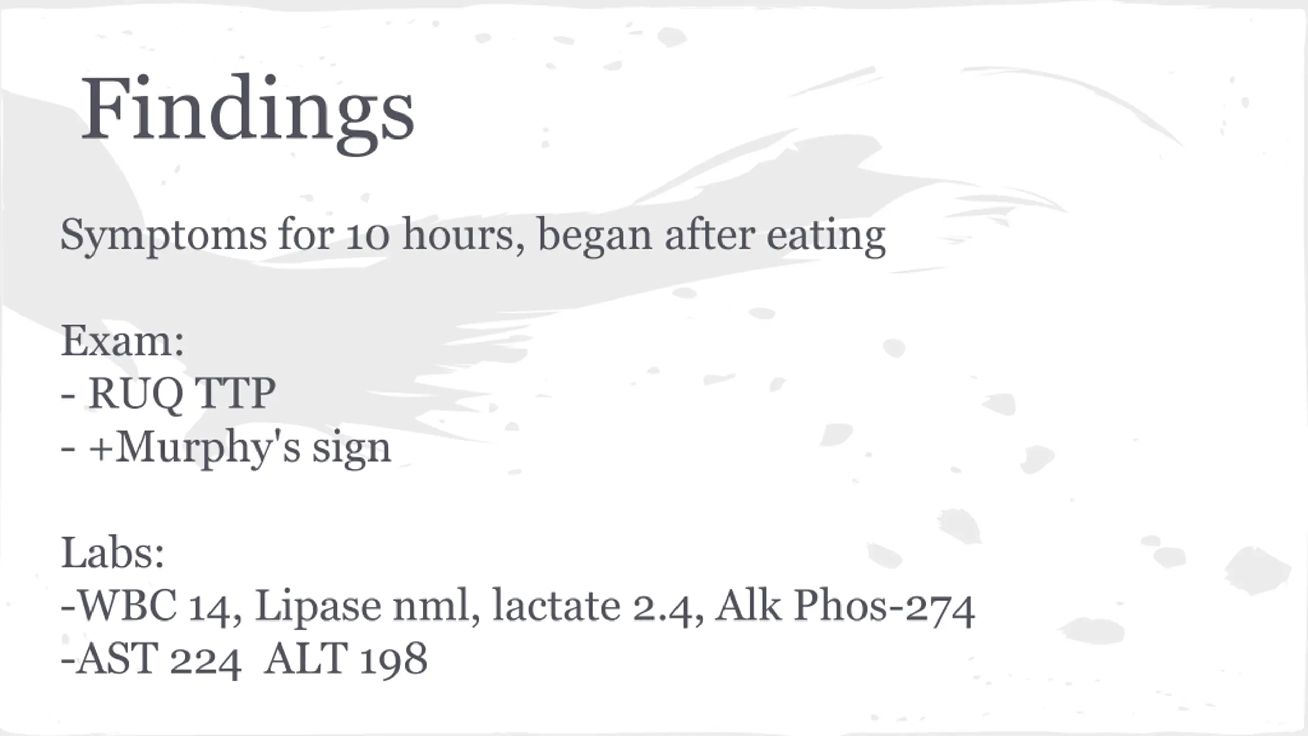Findings Symptoms for 10 hours, began after eating Exam: - RUQ TTP - +Murphy's sign Labs: -WBC 14, Lipase nml, lactate 2.4, Alk Phos-274 -AST 224 ALT 198
