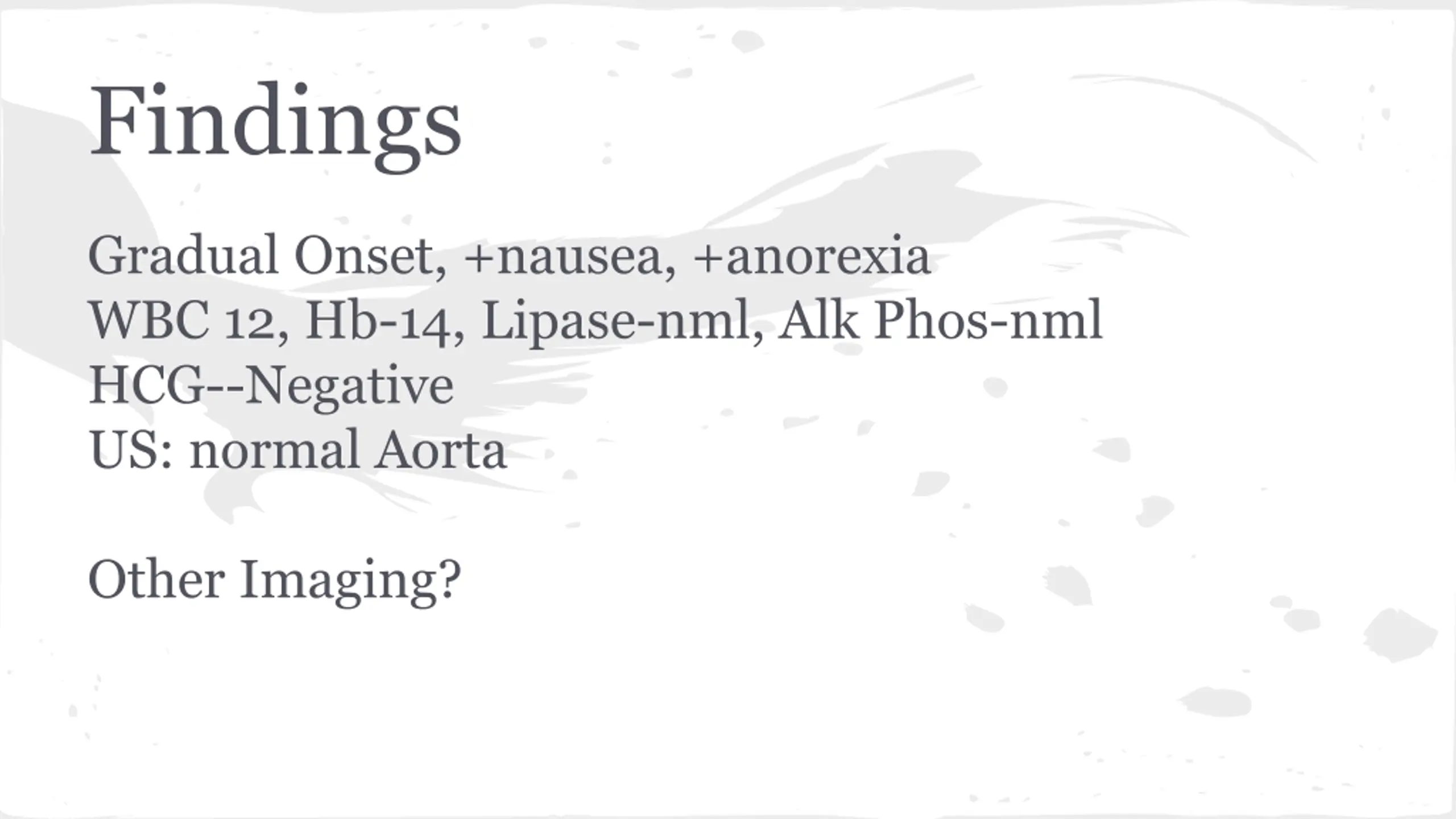 Findings Gradual Onset, +nausea, +anorexia WBC 12, Hb-14, Lipase-nml, Alk Phos-nml HCG--Negative US: normal Aorta Other Imaging?