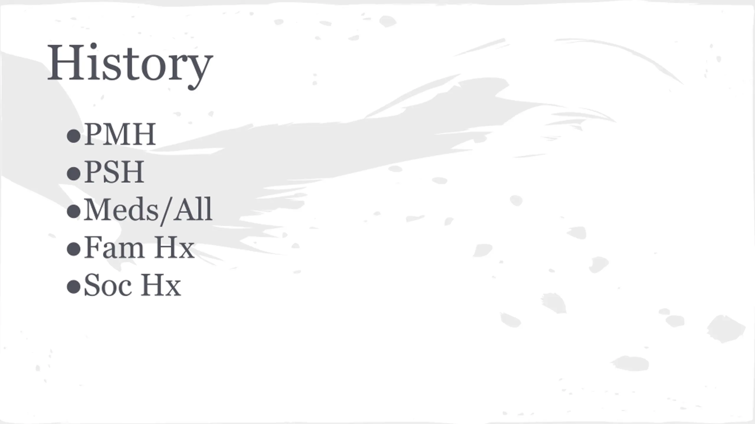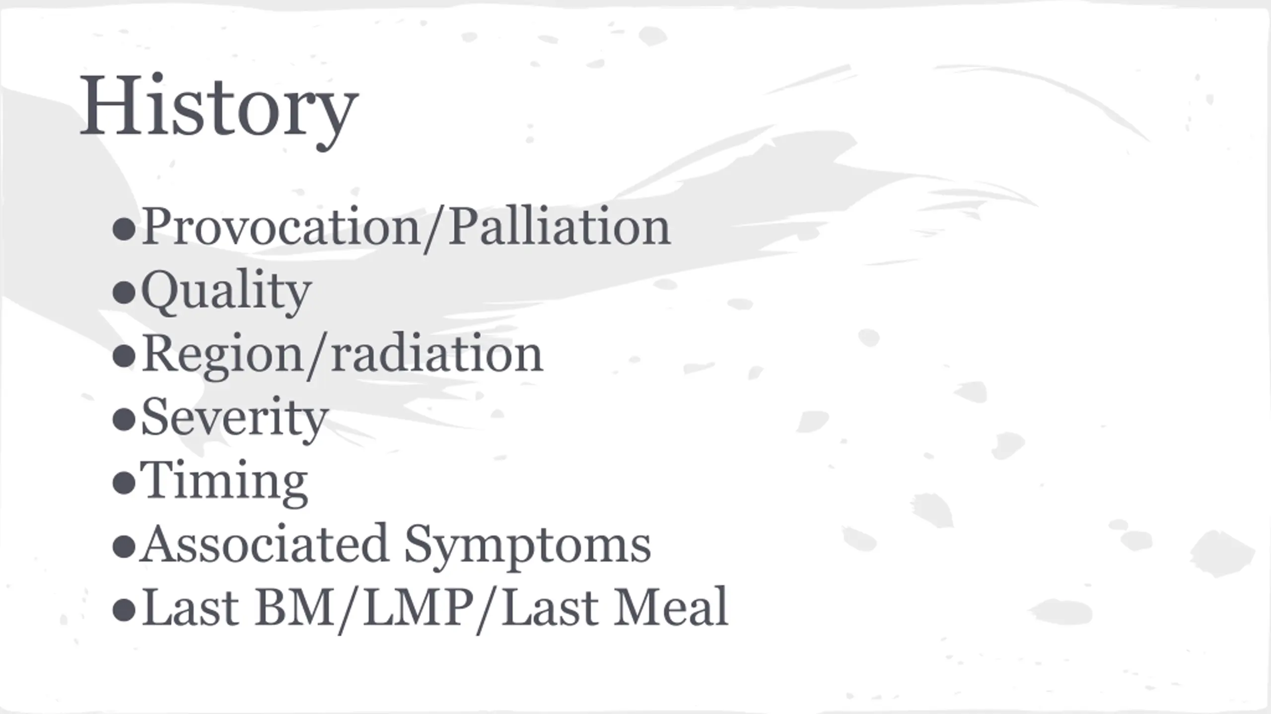 History Provocation/Palliation Quality Region/radiation Severity Timing Associated Symptoms Last BM/LMP/Last Meal