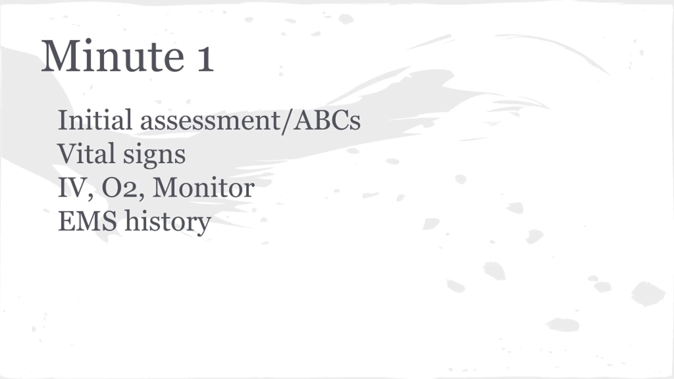 Minute 1 Initial assessment/ABCs Vital signs IV, O2, Monitor EMS history