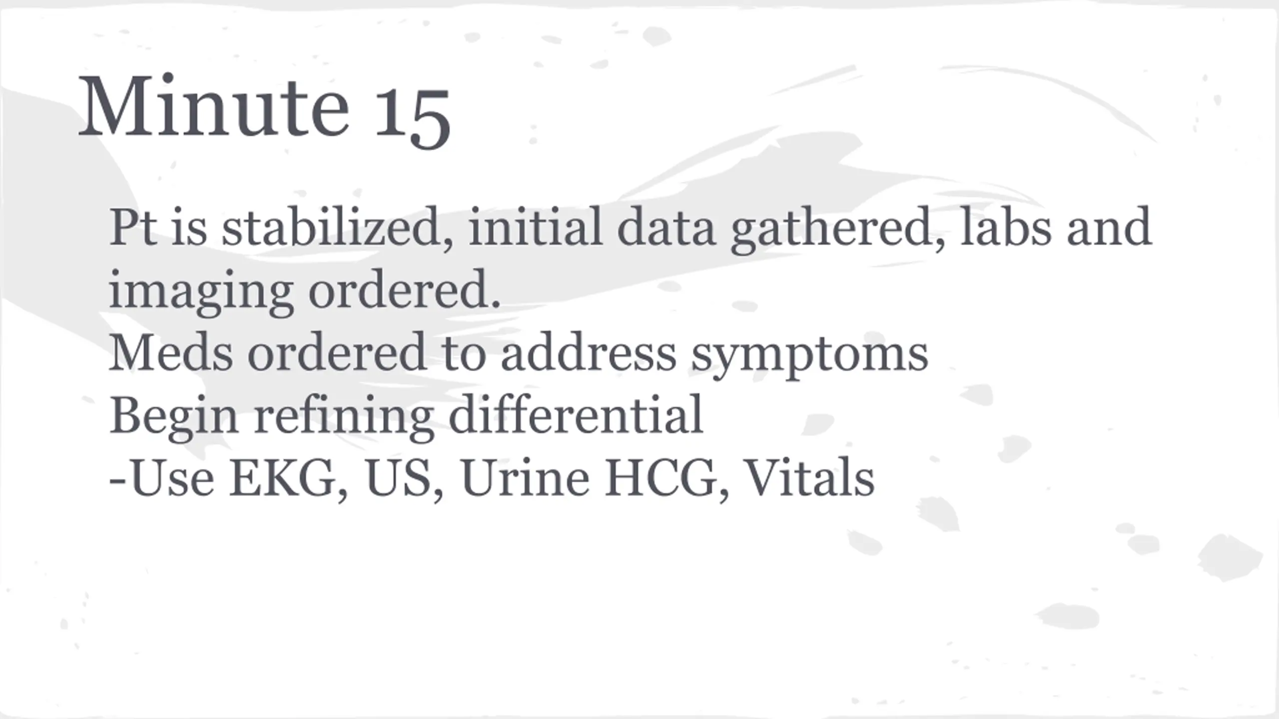Minute 15 Pt is stabilized, initial data gathered, labs and imaging ordered. Meds ordered to address symptoms Begin refining differential -Use EKG, US, Urine HCG, Vitals