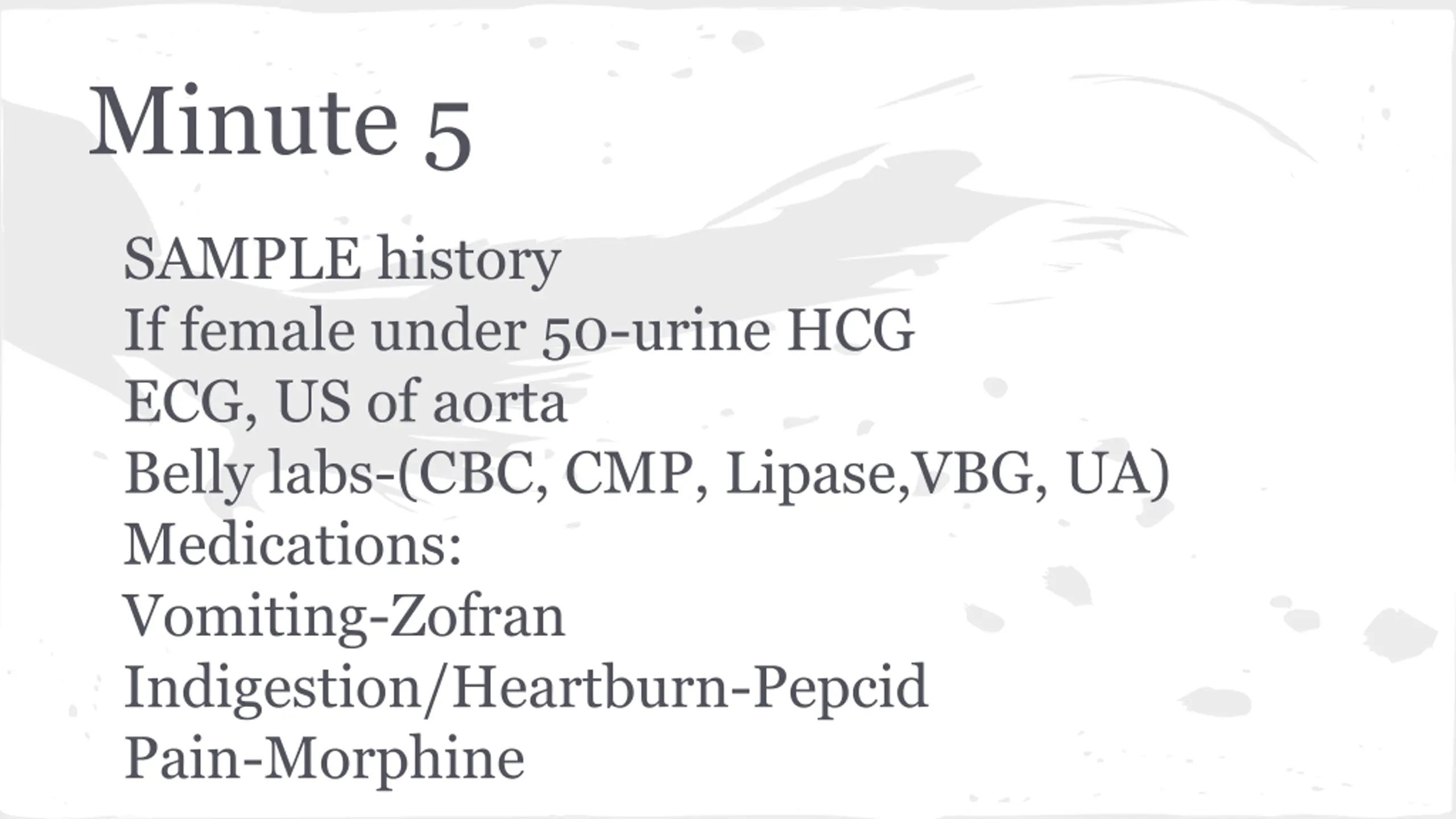 Minute 5 SAMPLE history If female under 50-urine HCG ECG, US of aorta Belly labs-(CBC, CMP, Lipase,VBG, UA) Medications: Vomiting-Zofran Indigestion/Heartburn-Pepcid Pain-Morphine