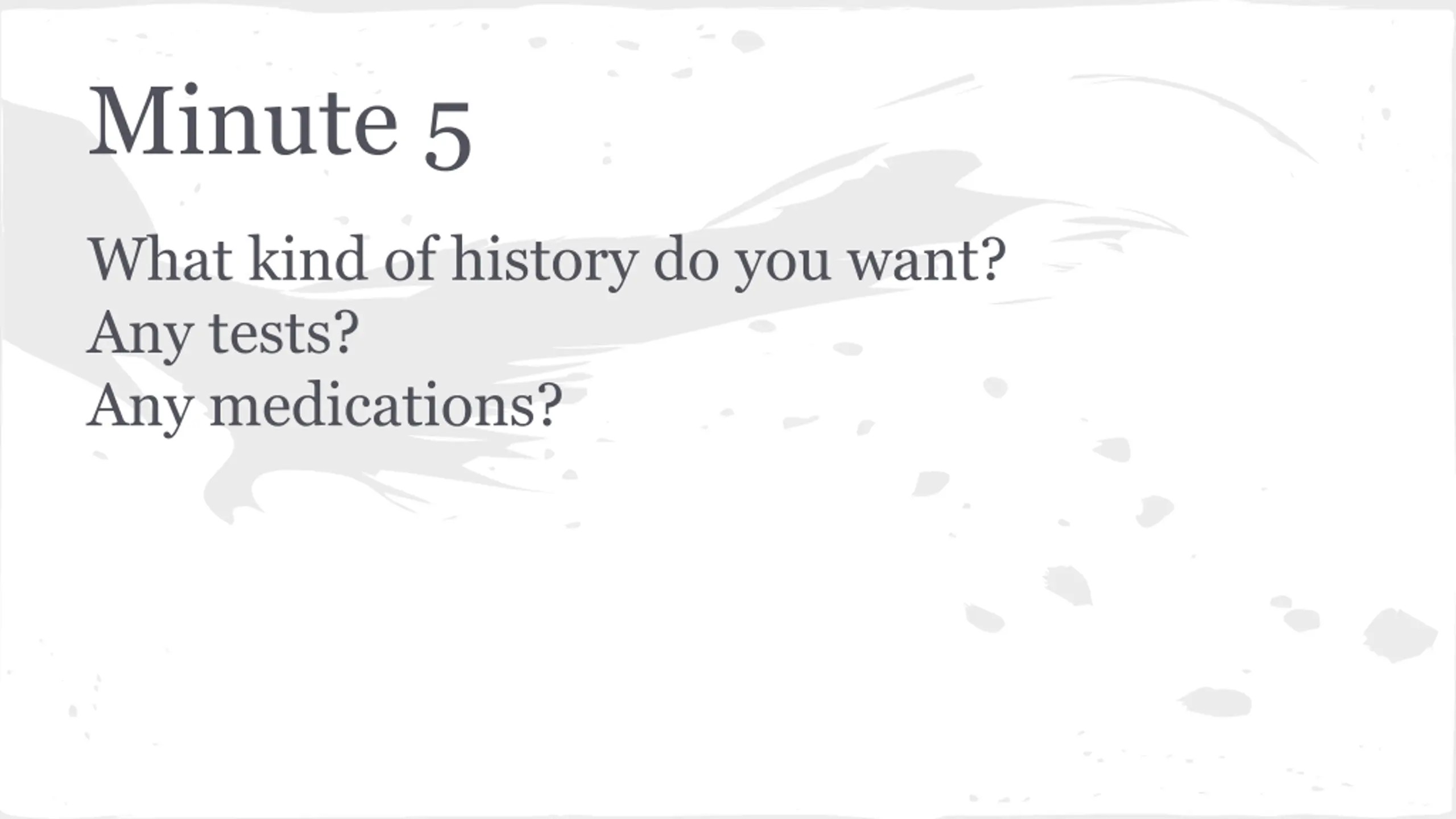 Minute 5 What kind of history do you want? Any tests? Any medications?