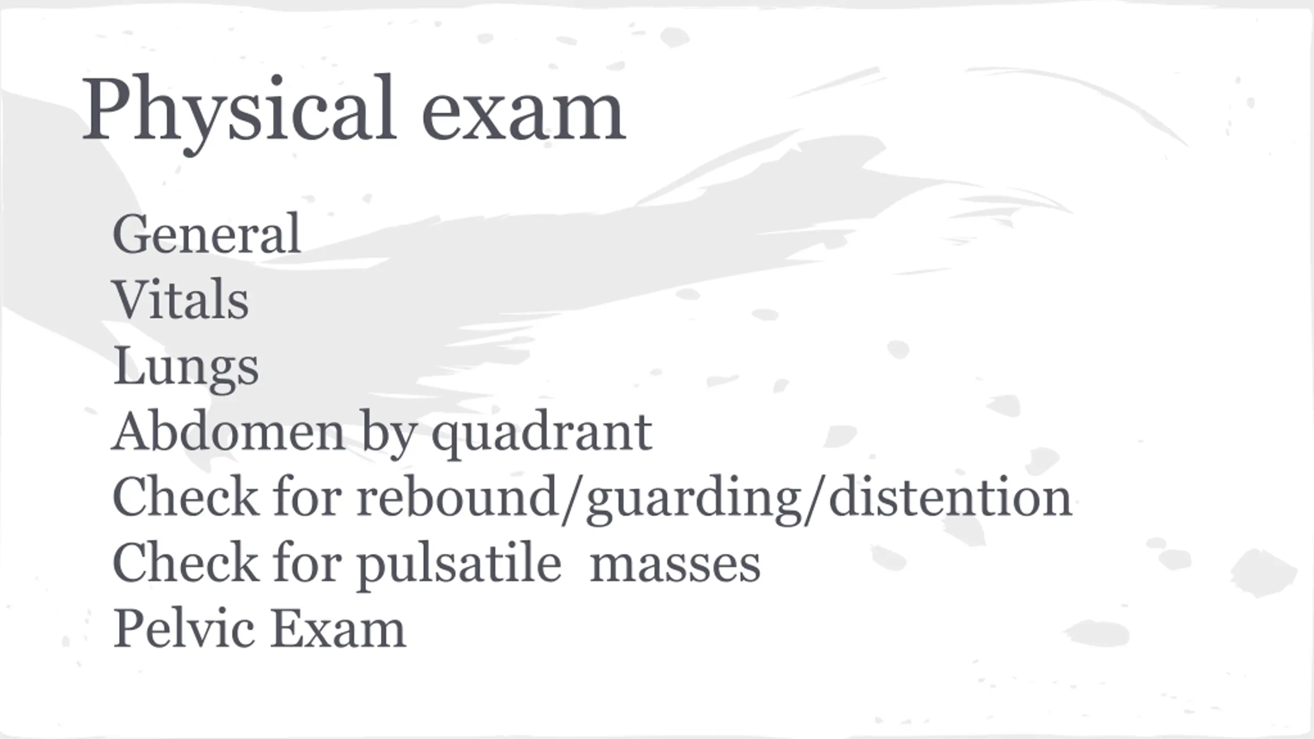 Physical exam General Vitals Lungs Abdomen by quadrant Check for rebound/guarding/distention Check for pulsatile masses Pelvic Exam