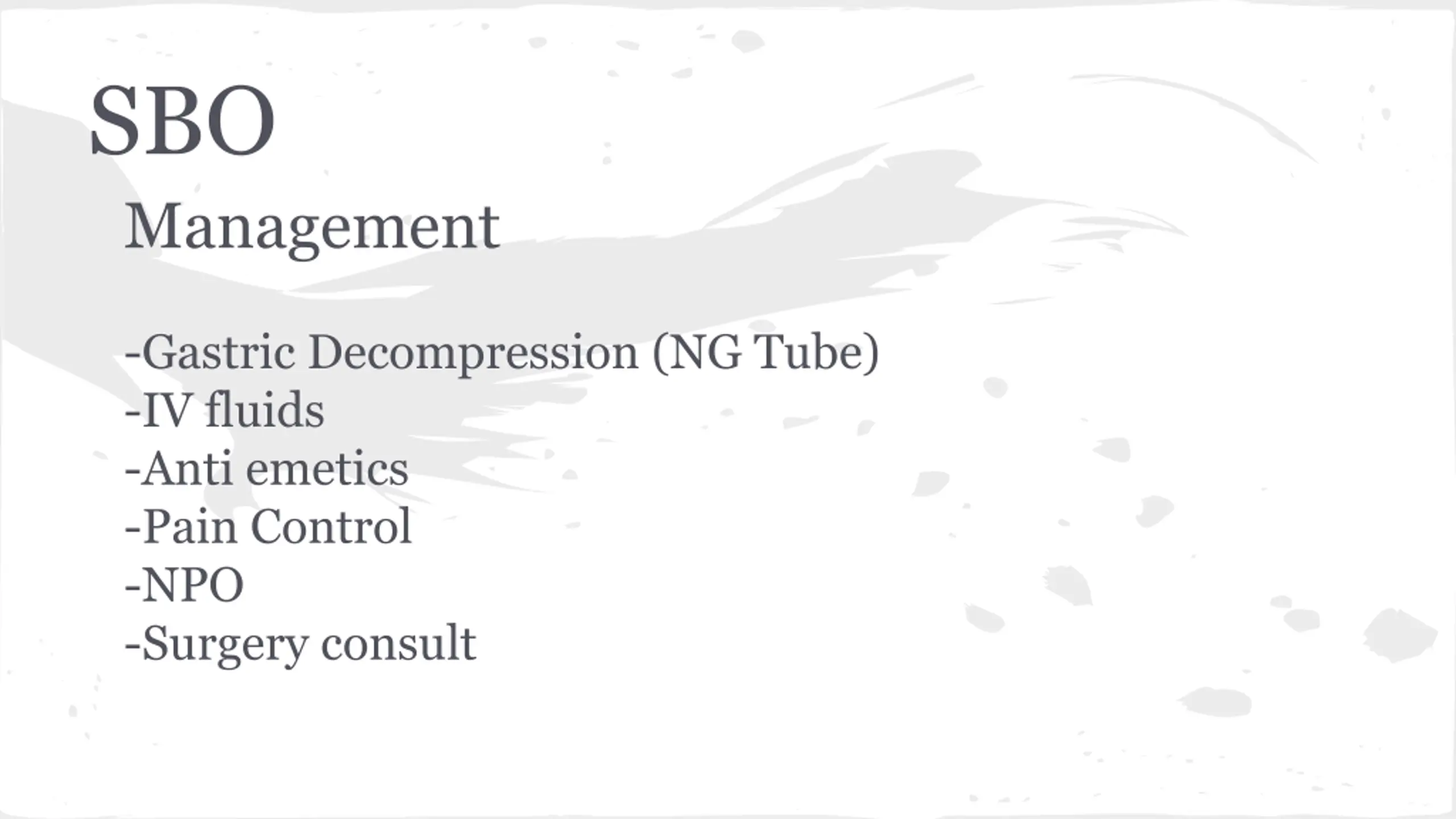 SBO Management -Gastric Decompression (NG Tube) -IV fluids -Anti emetics -Pain Control -NPO -Surgery consult