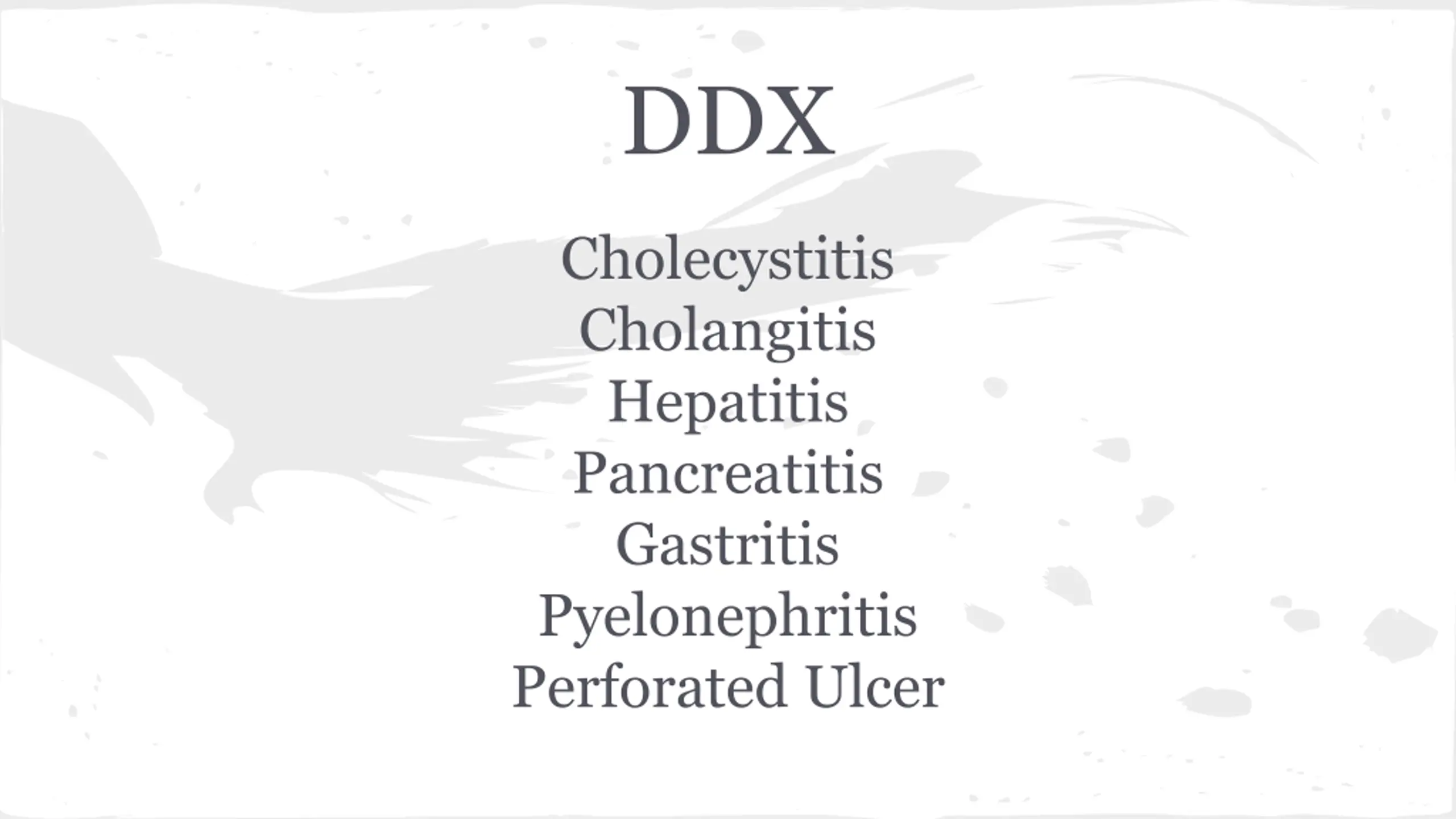 DDX Cholecystitis Cholangitis Hepatitis Pancreatitis Gastritis Pyelonephritis Perforated Ulcer