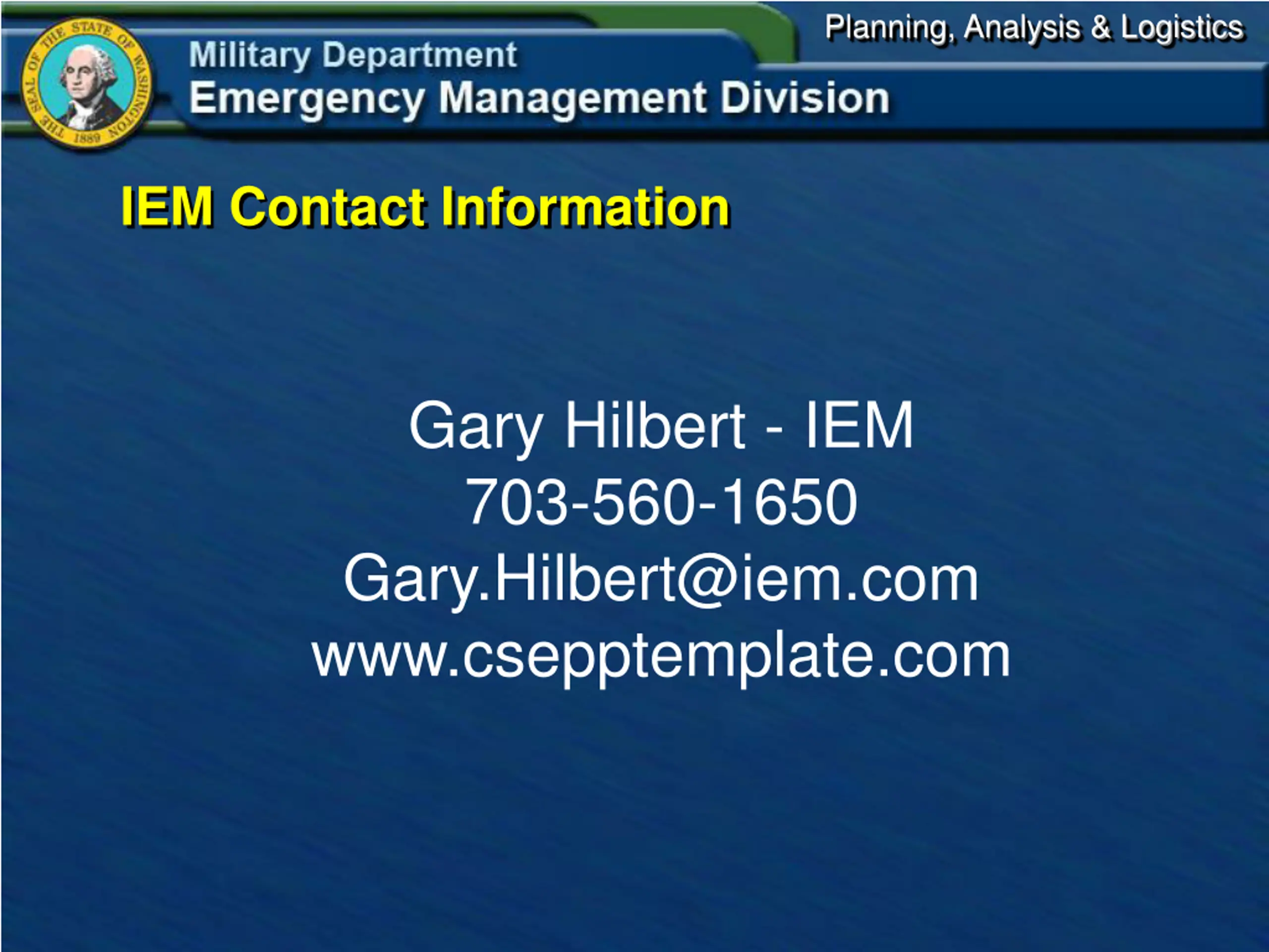 Planning, Analysis & Logistics IEM Contact Information Gary Hilbert - IEM 703-560-1650 Gary.Hilbert@iem.com www.csepptemplate.com