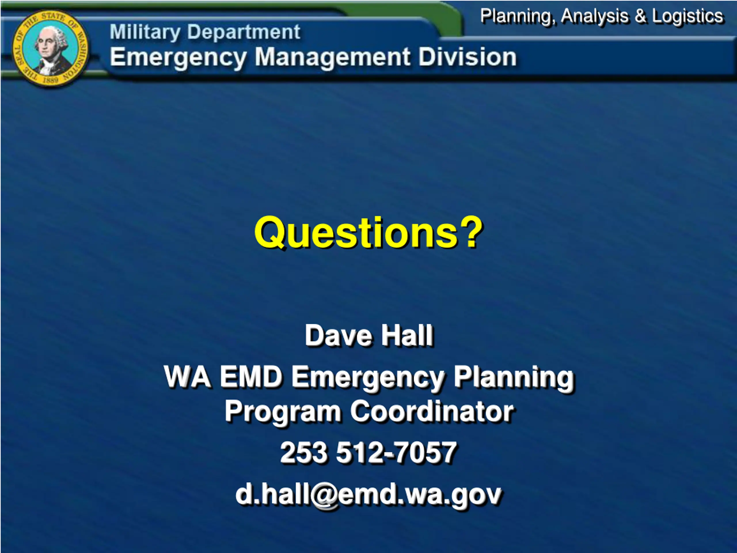 Planning, Analysis & Logistics Questions? Dave Hall WA EMD Emergency Planning Program Coordinator 253 512-7057 d.hall@emd.wa.gov