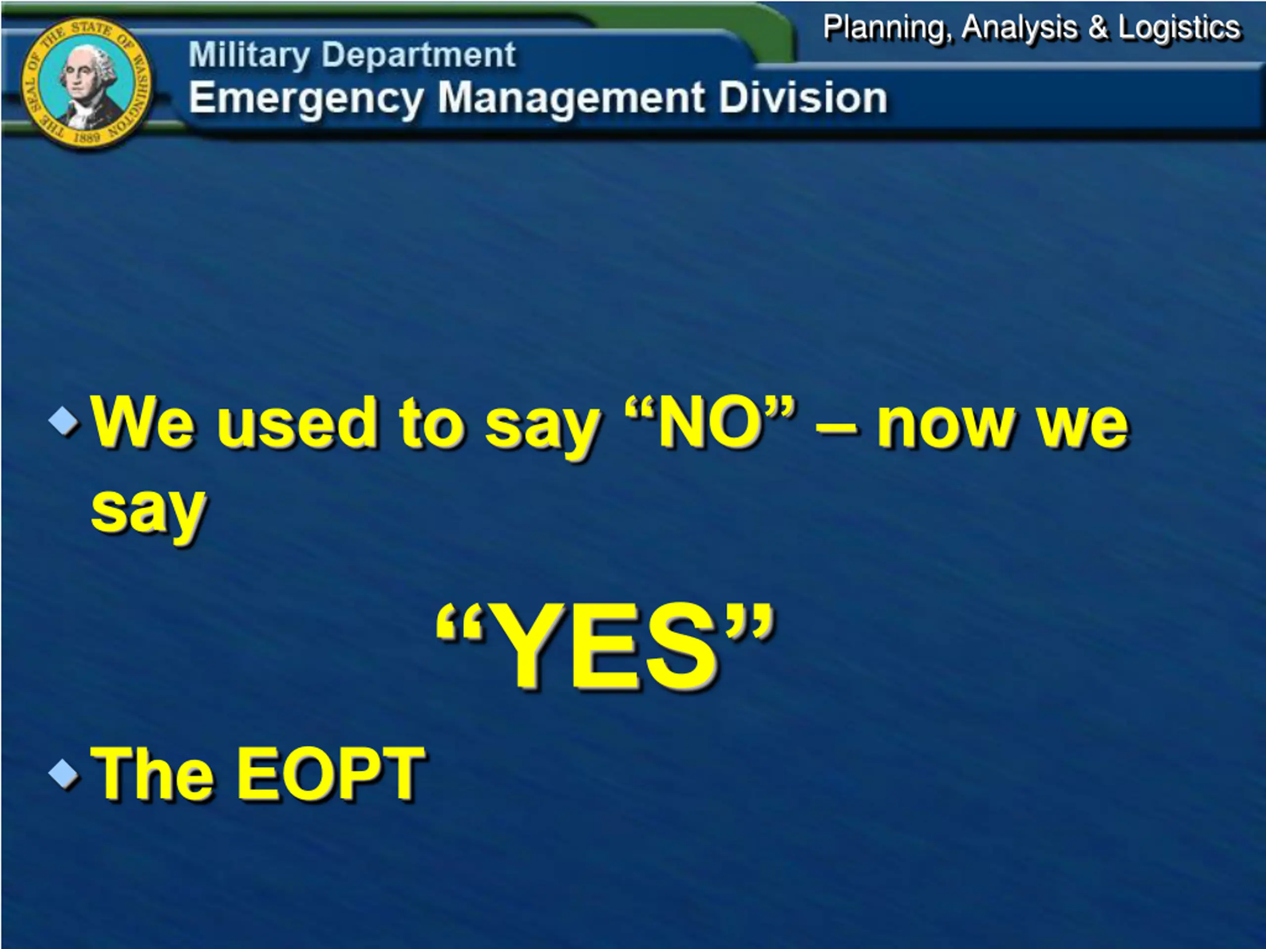 Planning, Analysis & Logistics We used to say NO now we say YES The EOPT