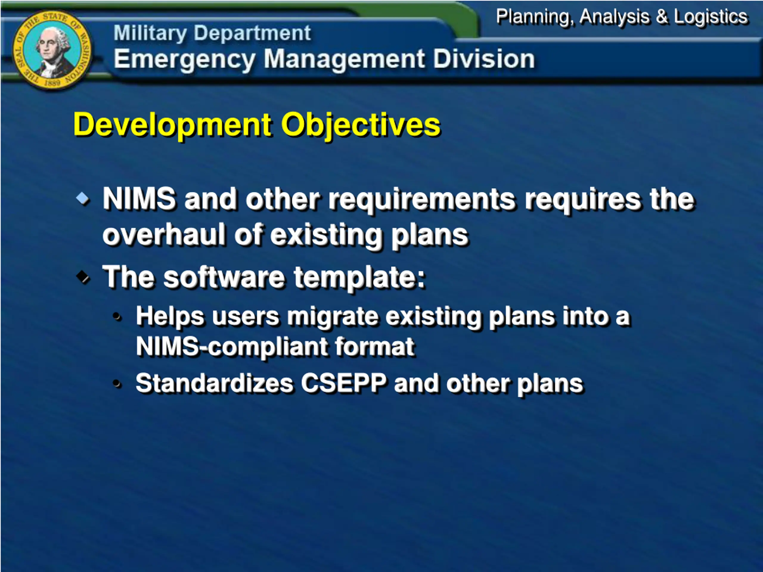 Planning, Analysis & Logistics Development Objectives NIMS and other requirements requires the overhaul of existing plans The software template: Helps users migrate existing plans into a NIMS-compliant format Standardizes CSEPP and other plans