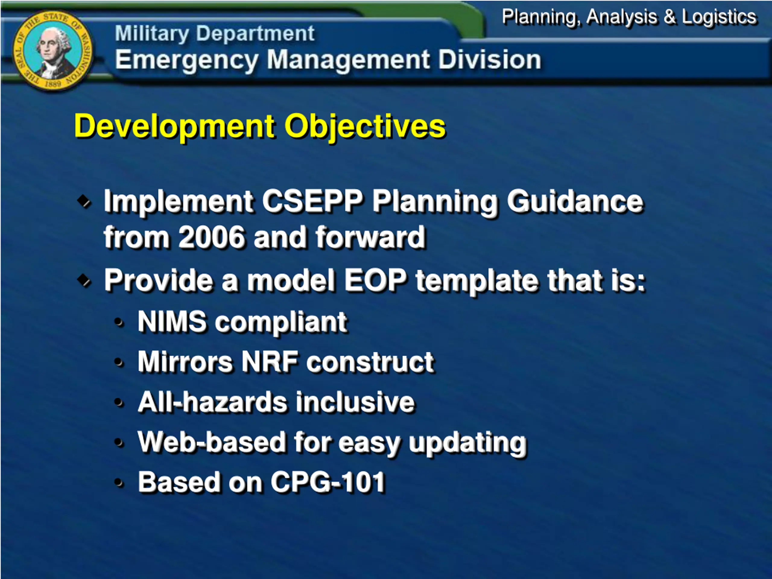 Planning, Analysis & Logistics Development Objectives Implement CSEPP Planning Guidance from 2006 and forward Provide a model EOP template that is: NIMS compliant Mirrors NRF construct All-hazards inclusive Web-based for easy updating Based on CPG-101
