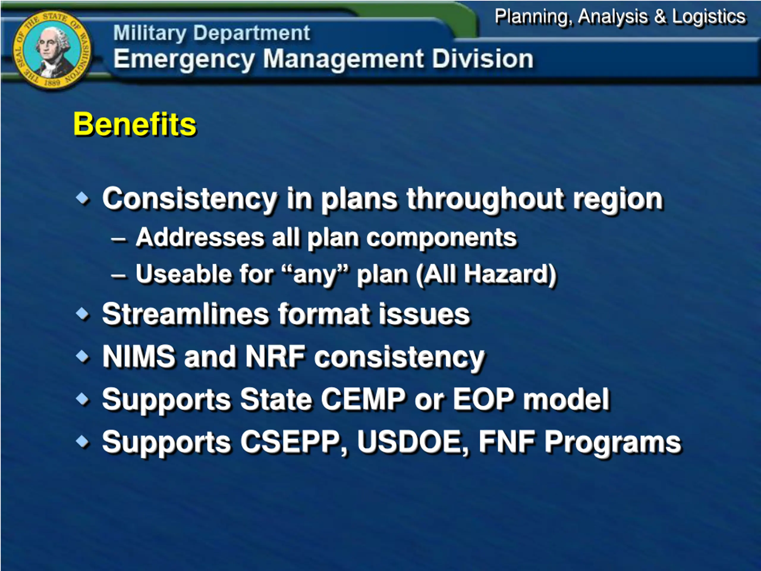 Planning, Analysis & Logistics Benefits Consistency in plans throughout region Addresses all plan components Useable for any plan (All Hazard) Streamlines format issues NIMS and NRF consistency Supports State CEMP or EOP model Supports CSEPP, USDOE, FNF Programs