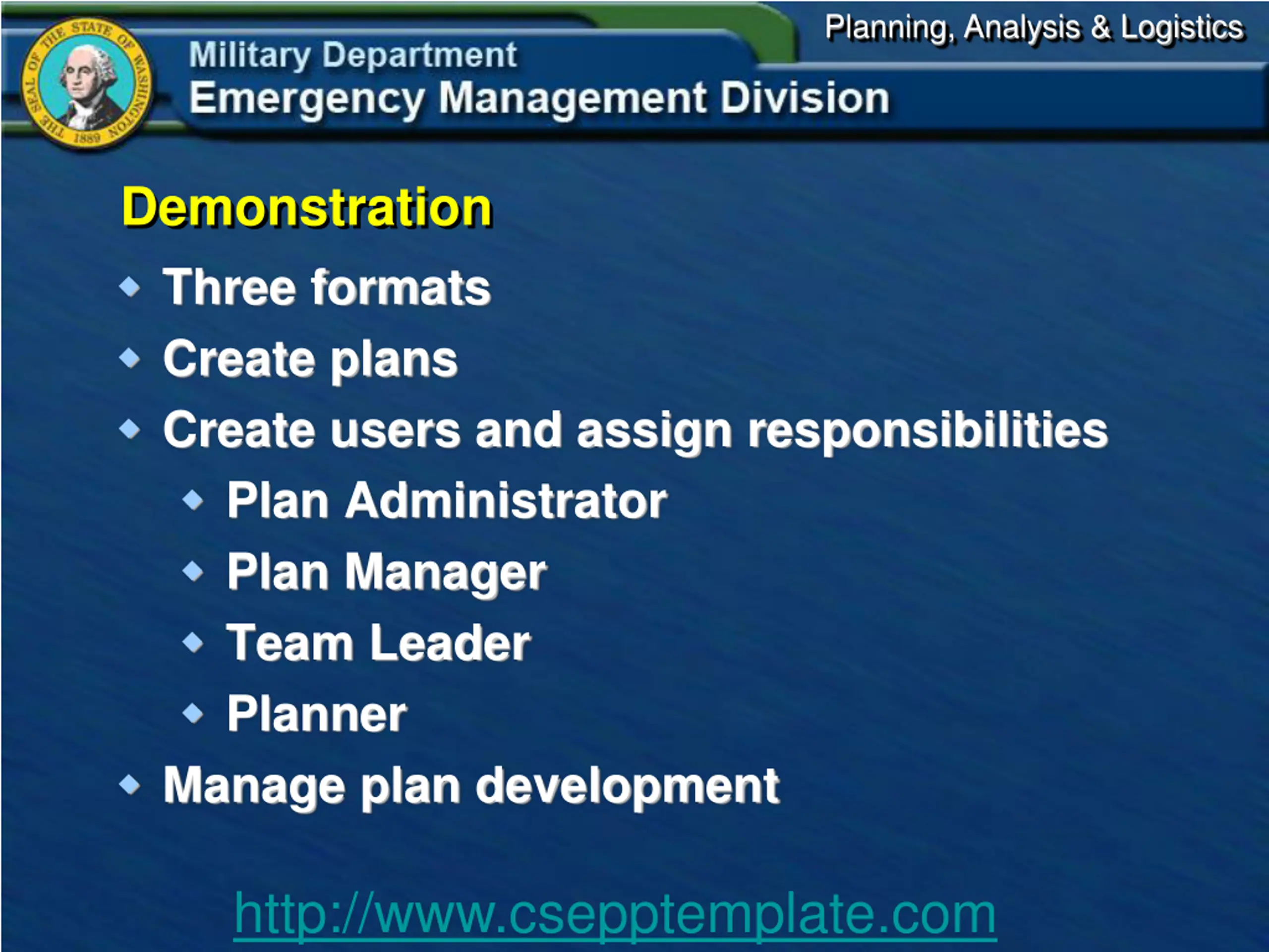 Planning, Analysis & Logistics Demonstration Three formats Create plans Create users and assign responsibilities Plan Administrator Plan Manager Team Leader Planner Manage plan development http://www.csepptemplate.com