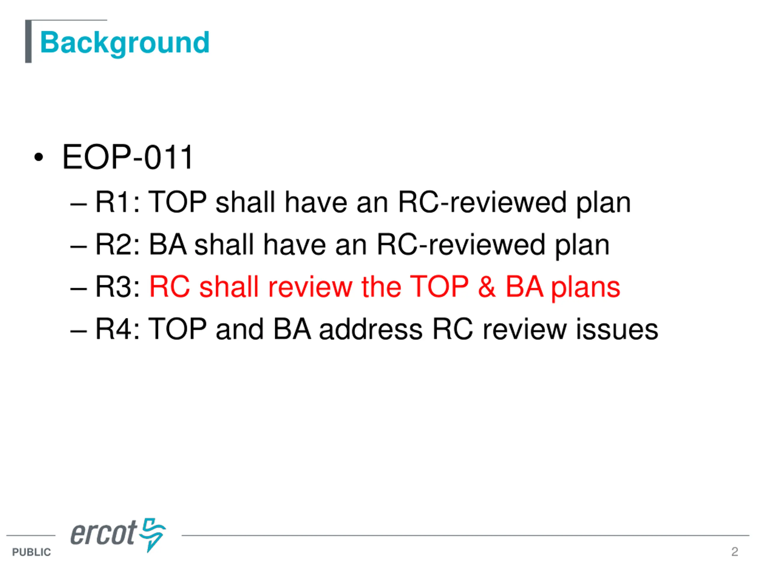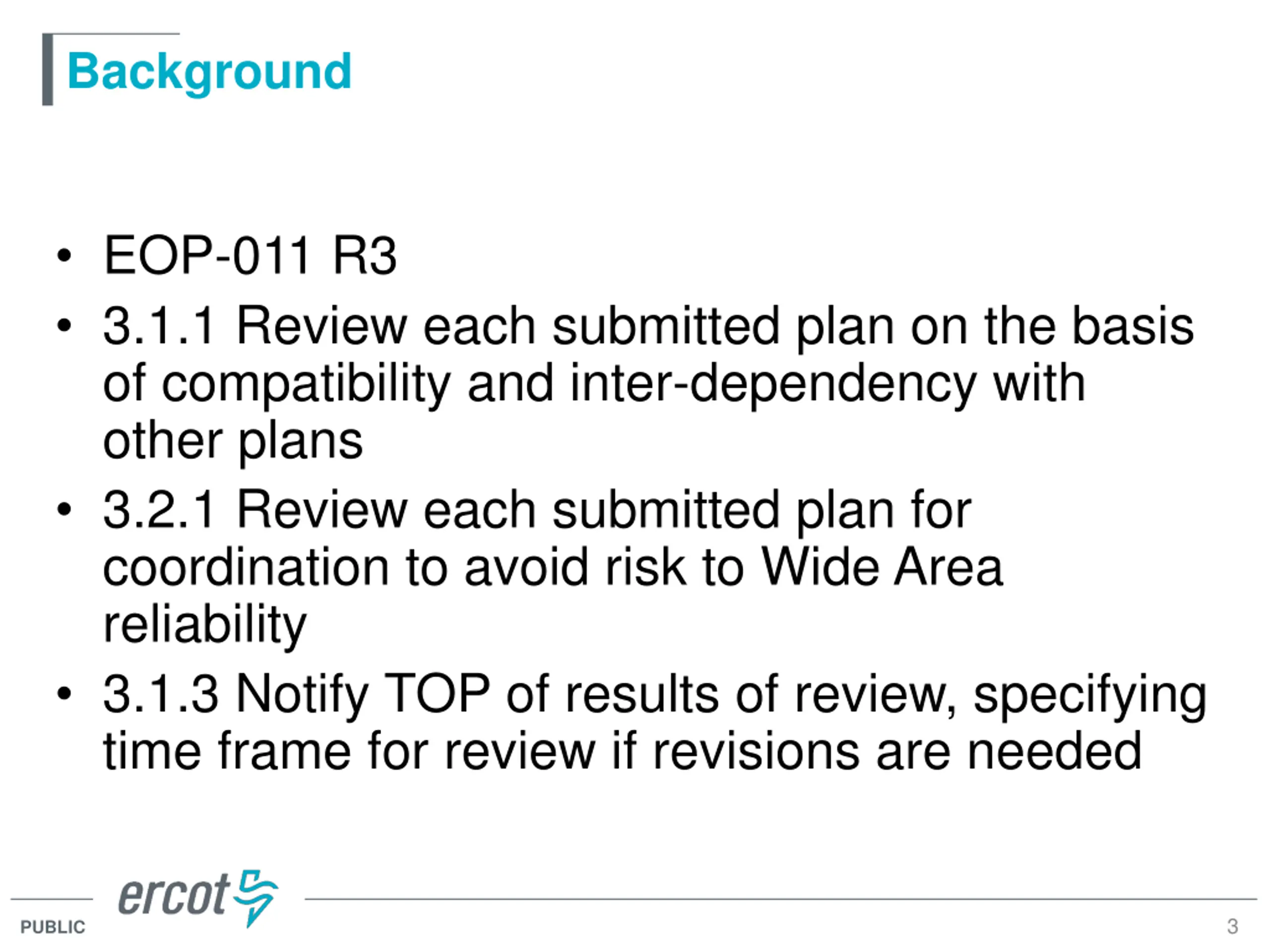 Background EOP-011 R1: TOP shall have an RC-reviewed plan R2: BA shall have an RC-reviewed plan R3: RC shall review the TOP & BA plans R4: TOP and BA address RC review issues 2 PUBLIC