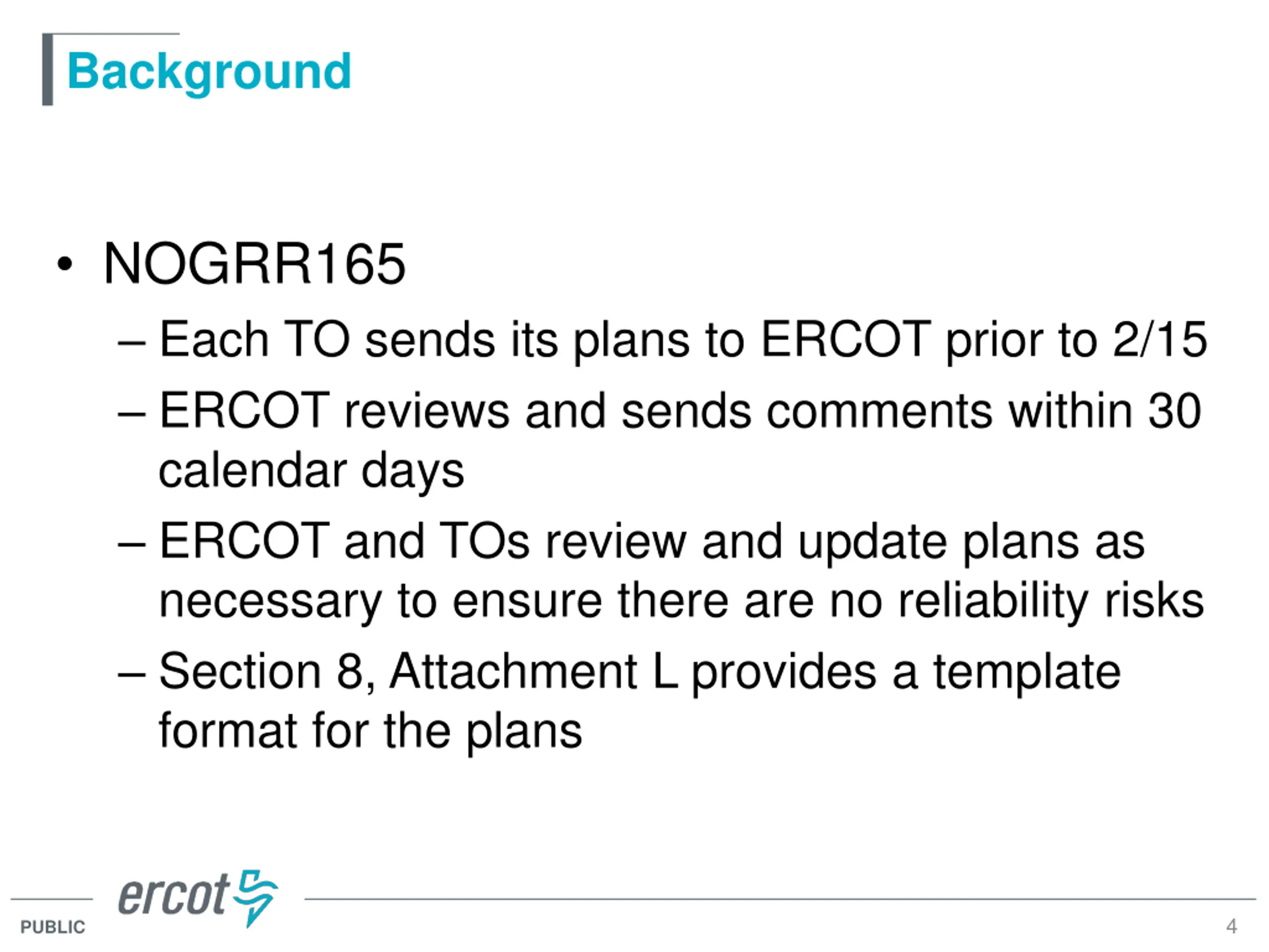 Background EOP-011 R3 3.1.1 Review each submitted plan on the basis of compatibility and inter-dependency with other plans 3.2.1 Review each submitted plan for coordination to avoid risk to Wide Area reliability 3.1.3 Notify TOP of results of review, specifying time frame for review if revisions are needed 3 PUBLIC