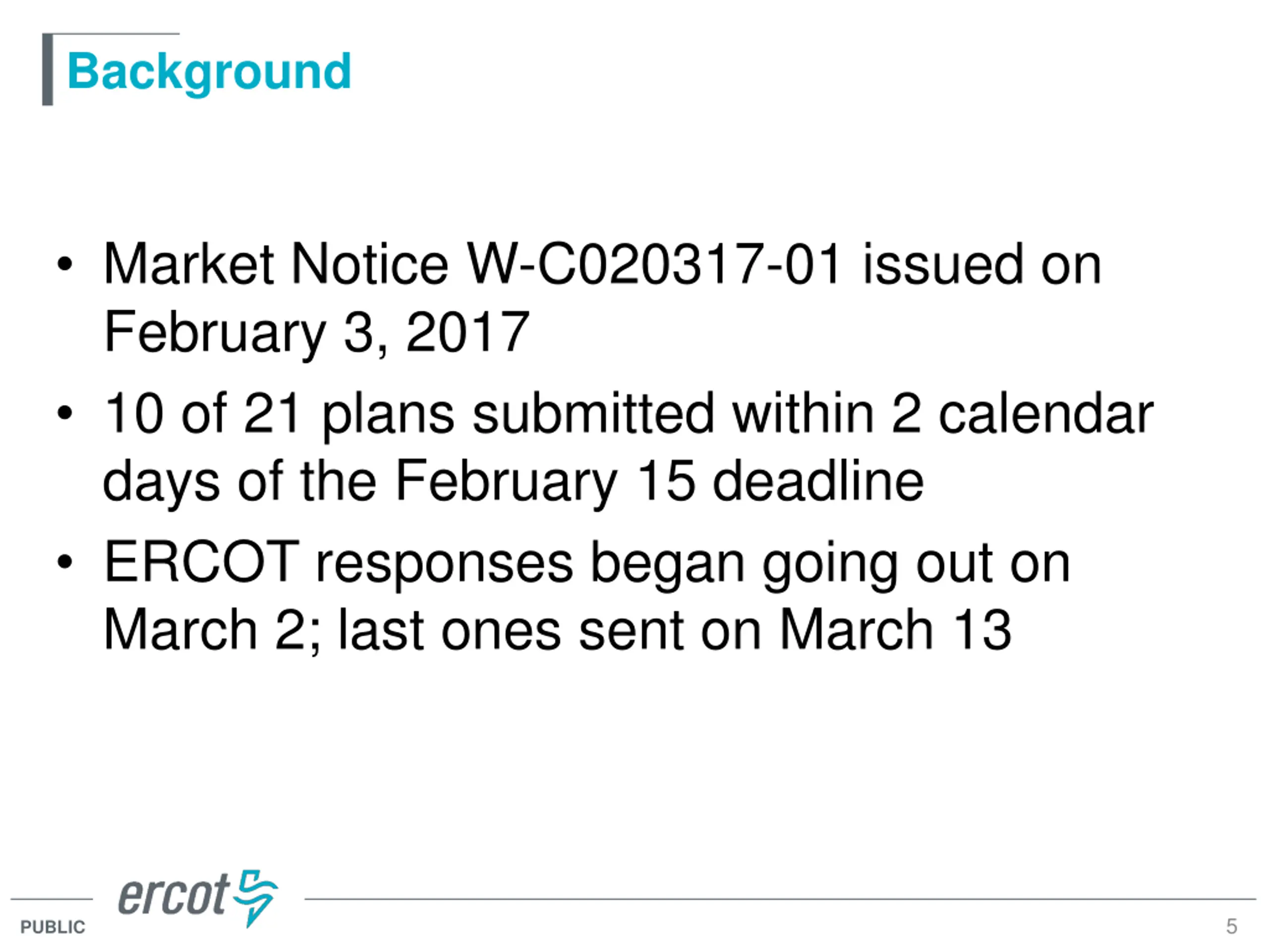 Background Market Notice W-C020317-01 issued on February 3, 2017 10 of 21 plans submitted within 2 calendar days of the February 15 deadline ERCOT responses began going out on March 2; last ones sent on March 13 5 PUBLIC