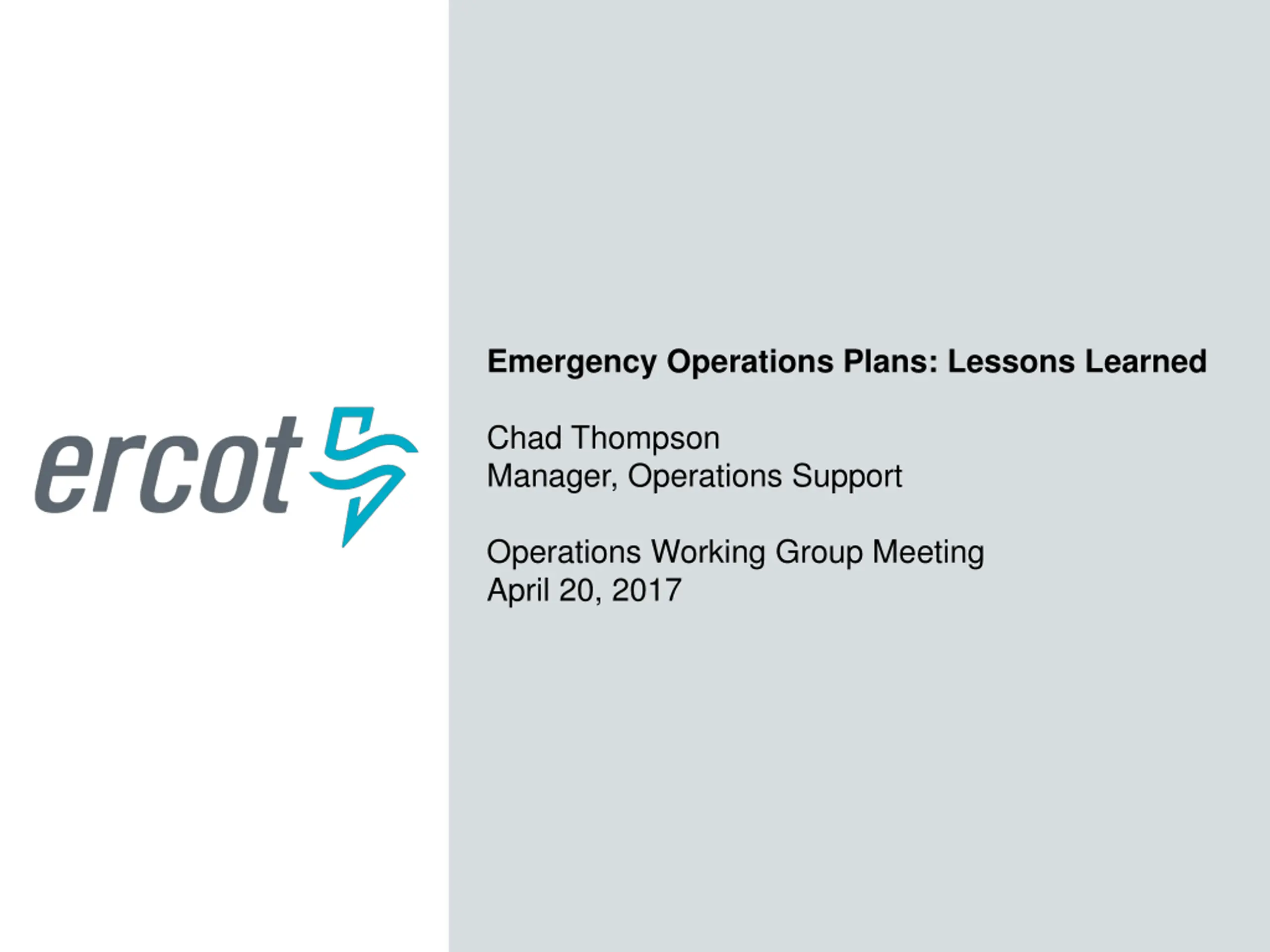 Emergency Operations Plans: Lessons Learned Chad Thompson Manager, Operations Support Operations Working Group Meeting April 20, 2017
