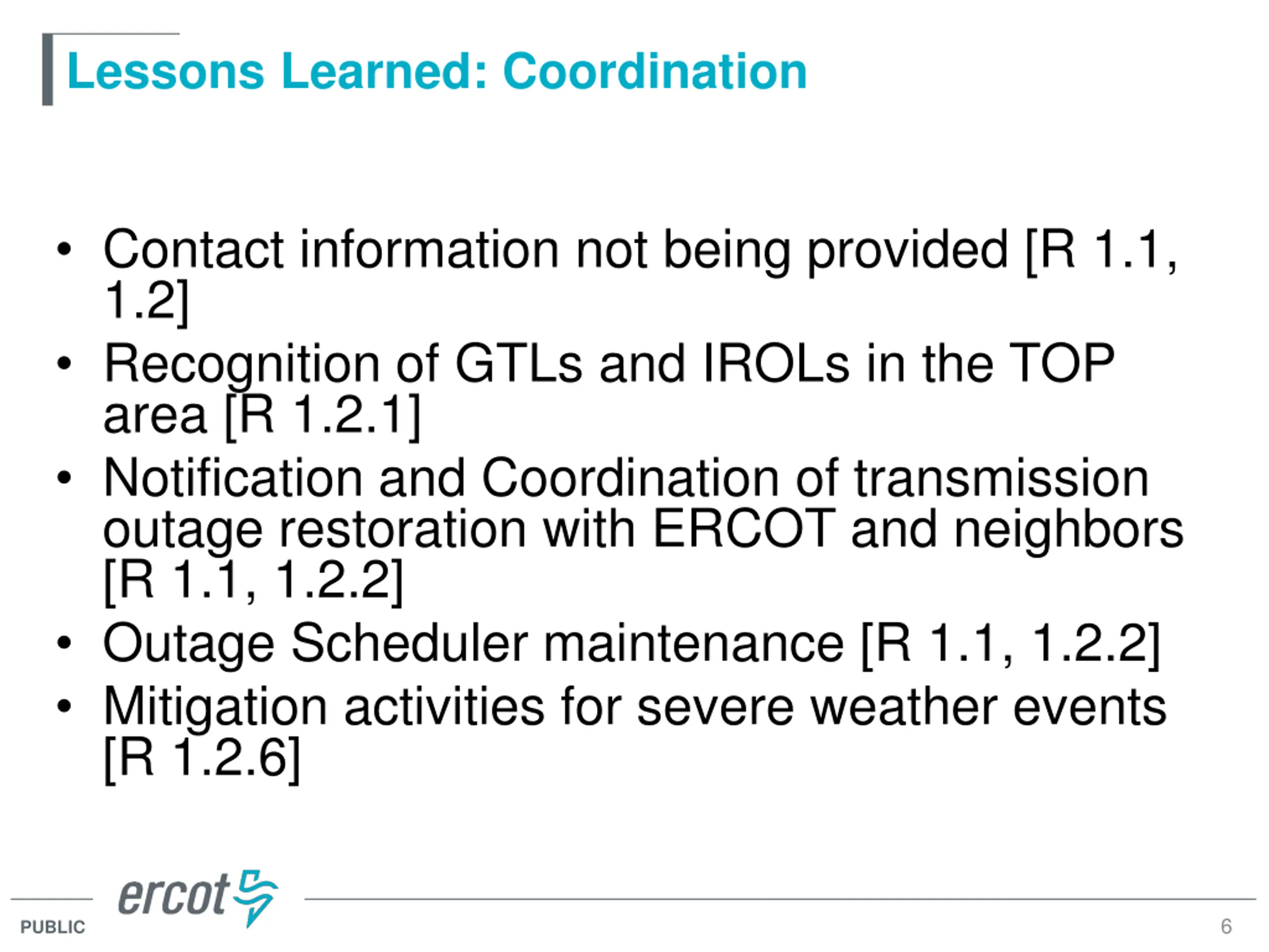Lessons Learned: Coordination Contact information not being provided [R 1.1, 1.2] Recognition of GTLs and IROLs in the TOP area [R 1.2.1] Notification and Coordination of transmission outage restoration with ERCOT and neighbors [R 1.1, 1.2.2] Outage Scheduler maintenance [R 1.1, 1.2.2] Mitigation activities for severe weather events [R 1.2.6] 6 PUBLIC