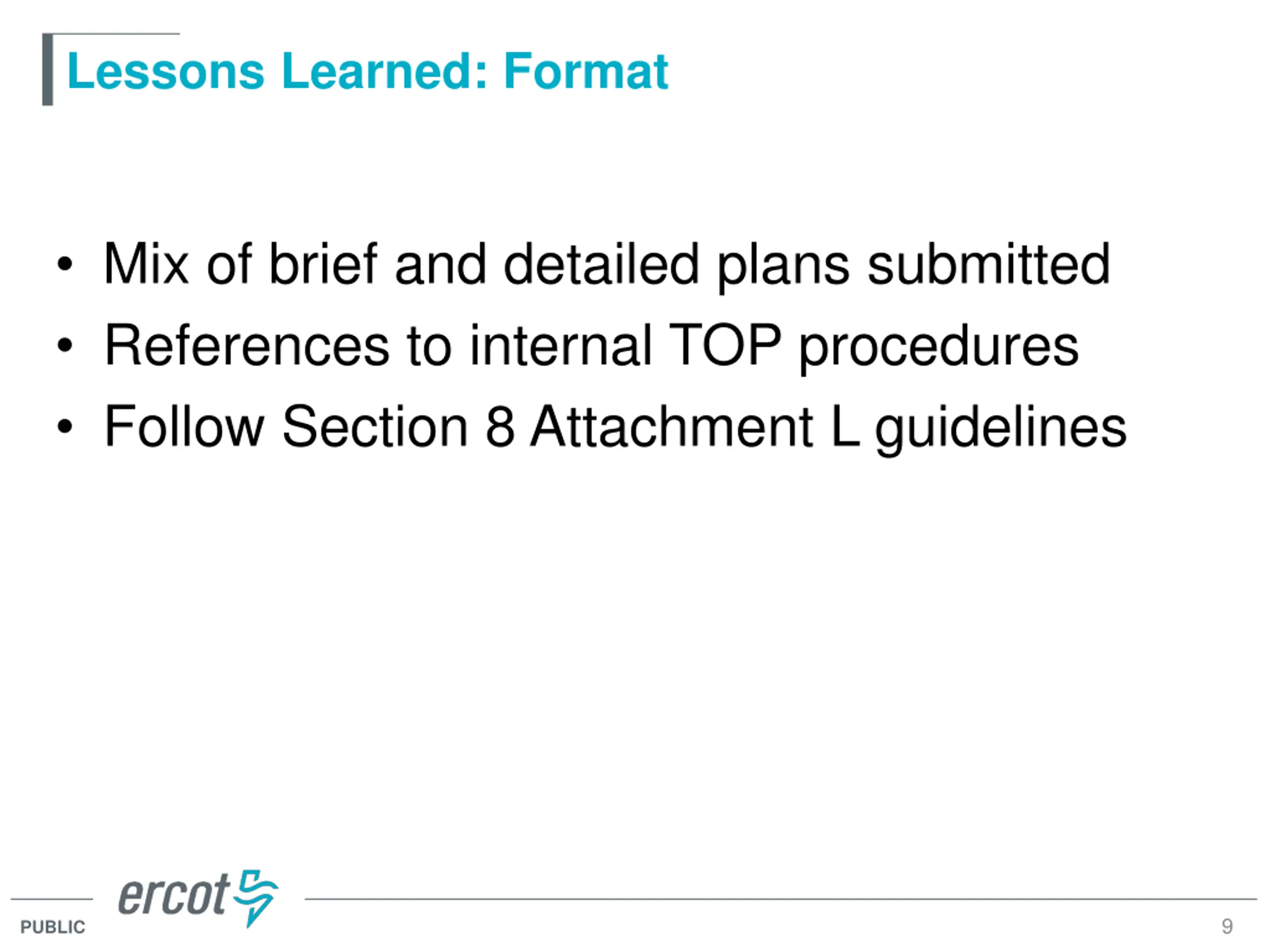 Lessons Learned: Format Mix of brief and detailed plans submitted References to internal TOP procedures Follow Section 8 Attachment L guidelines 9 PUBLIC