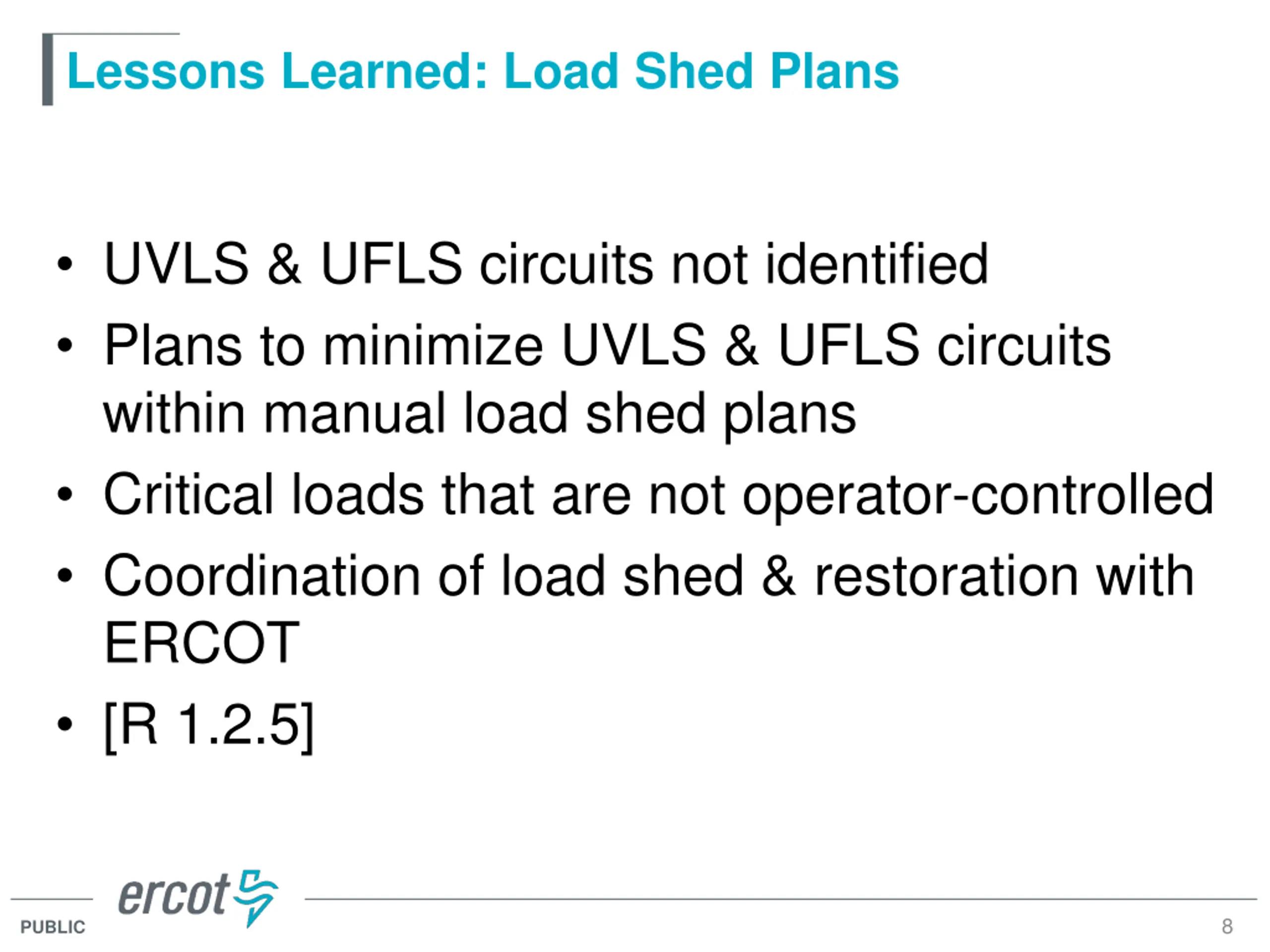 Lessons Learned: Load Shed Plans UVLS & UFLS circuits not identified Plans to minimize UVLS & UFLS circuits within manual load shed plans Critical loads that are not operator-controlled Coordination of load shed & restoration with ERCOT [R 1.2.5] 8 PUBLIC