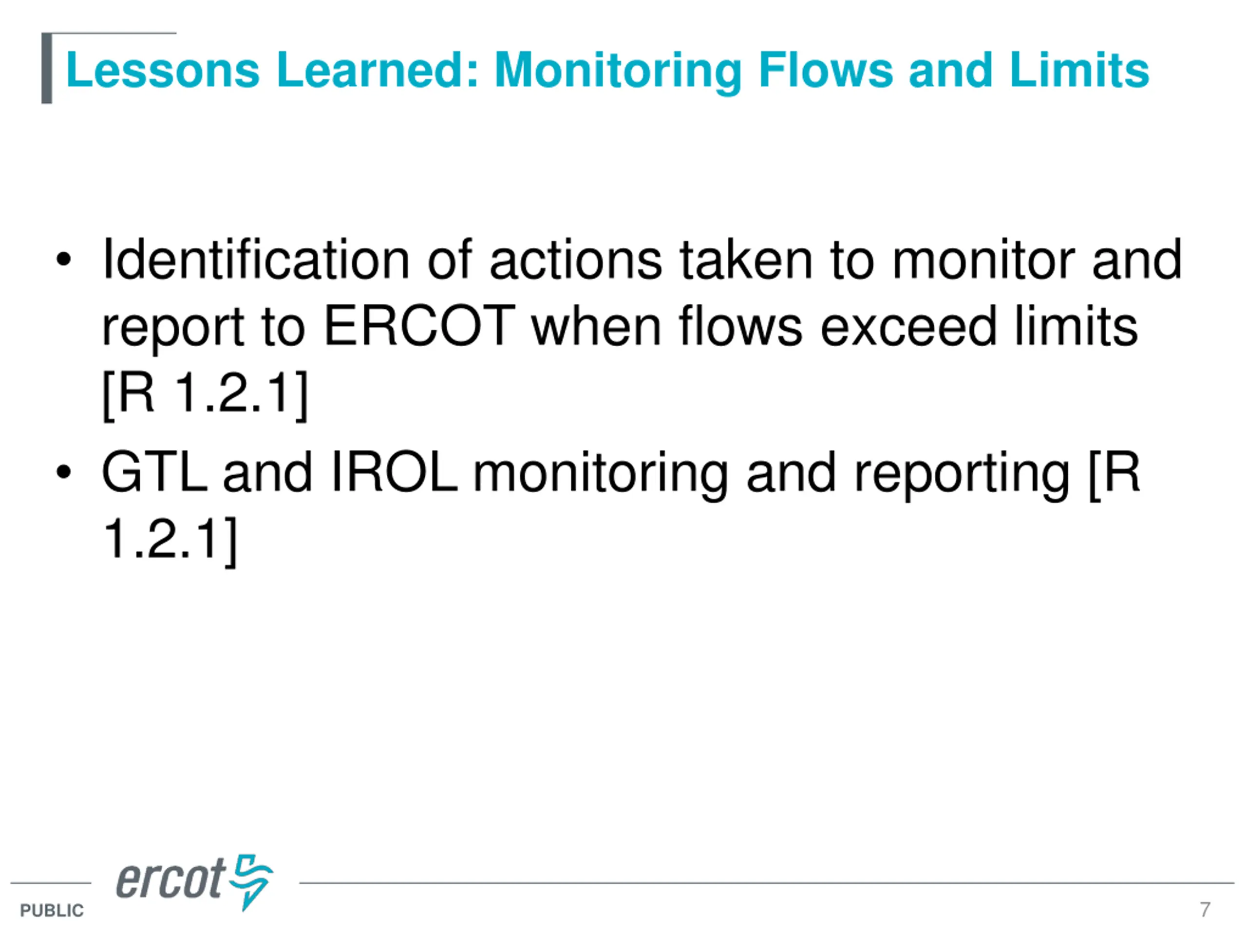 Lessons Learned: Monitoring Flows and Limits Identification of actions taken to monitor and report to ERCOT when flows exceed limits [R 1.2.1] GTL and IROL monitoring and reporting [R 1.2.1] 7 PUBLIC