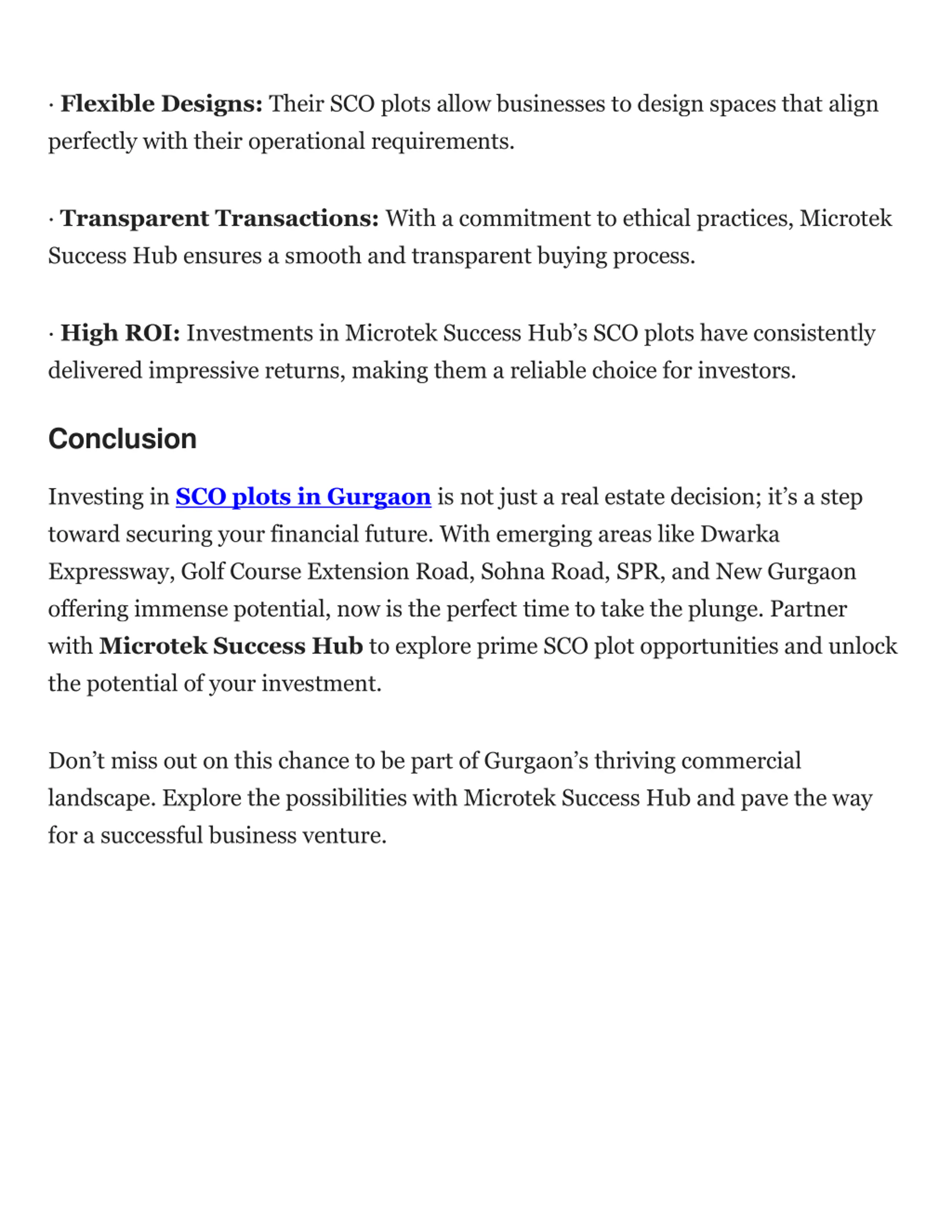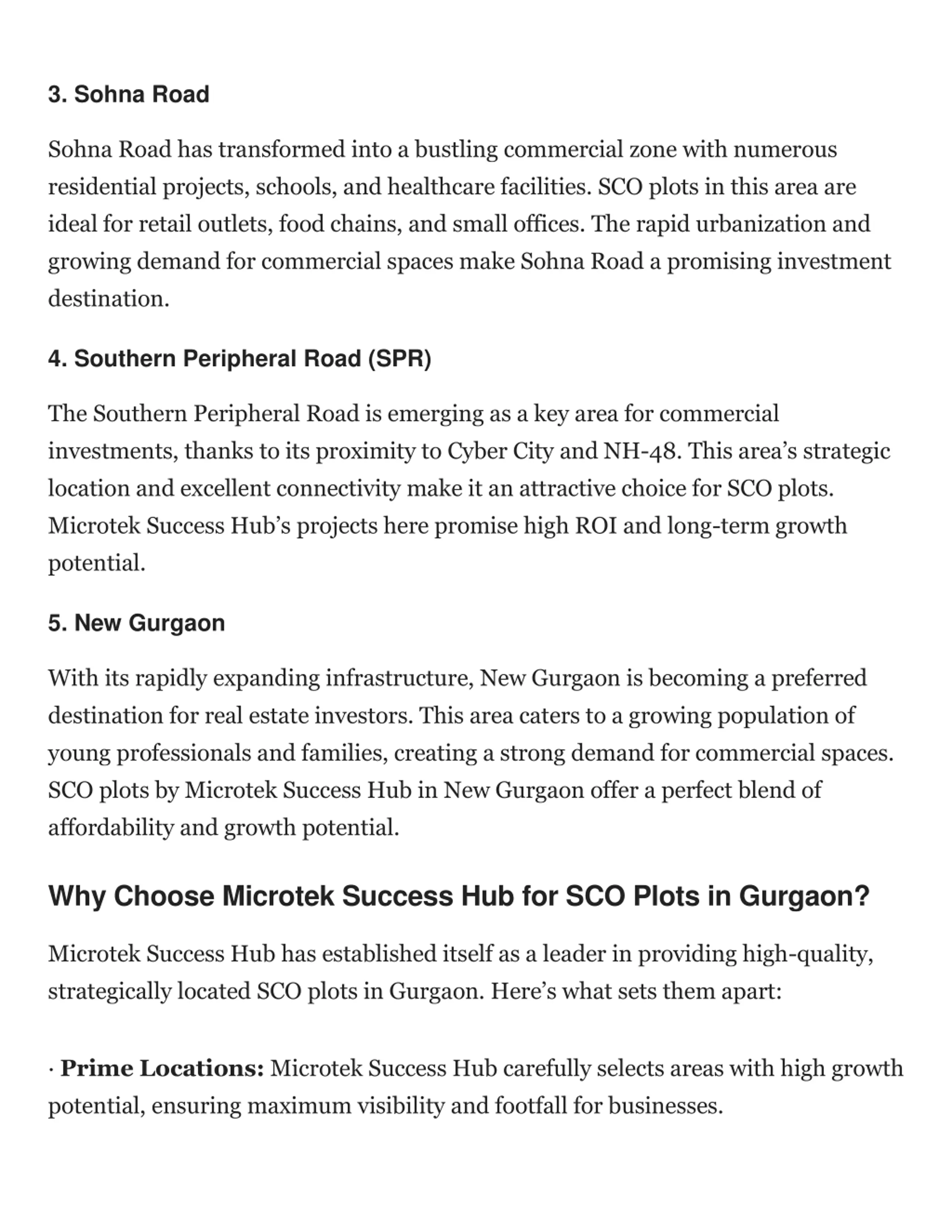 3. Sohna Road Sohna Road has transformed into a bustling commercial zone with numerous residential projects, schools, and healthcare facilities. SCO plots in this area are ideal for retail outlets, food chains, and small offices. The rapid urbanization and growing demand for commercial spaces make Sohna Road a promising investment destination. 4. Southern Peripheral Road (SPR) The Southern Peripheral Road is emerging as a key area for commercial investments, thanks to its proximity to Cyber City and NH-48. This area s strategic location and excellent connectivity make it an attractive choice for SCO plots. Microtek Success Hub s projects here promise high ROI and long-term growth potential. 5. New Gurgaon With its rapidly expanding infrastructure, New Gurgaon is becoming a preferred destination for real estate investors. This area caters to a growing population of young professionals and families, creating a strong demand for commercial spaces. SCO plots by Microtek Success Hub in New Gurgaon offer a perfect blend of affordability and growth potential. Why Choose Microtek Success Hub for SCO Plots in Gurgaon? Microtek Success Hub has established itself as a leader in providing high-quality, strategically located SCO plots in Gurgaon. Here s what sets them apart: Prime Locations: Microtek Success Hub carefully selects areas with high growth potential, ensuring maximum visibility and footfall for businesses.