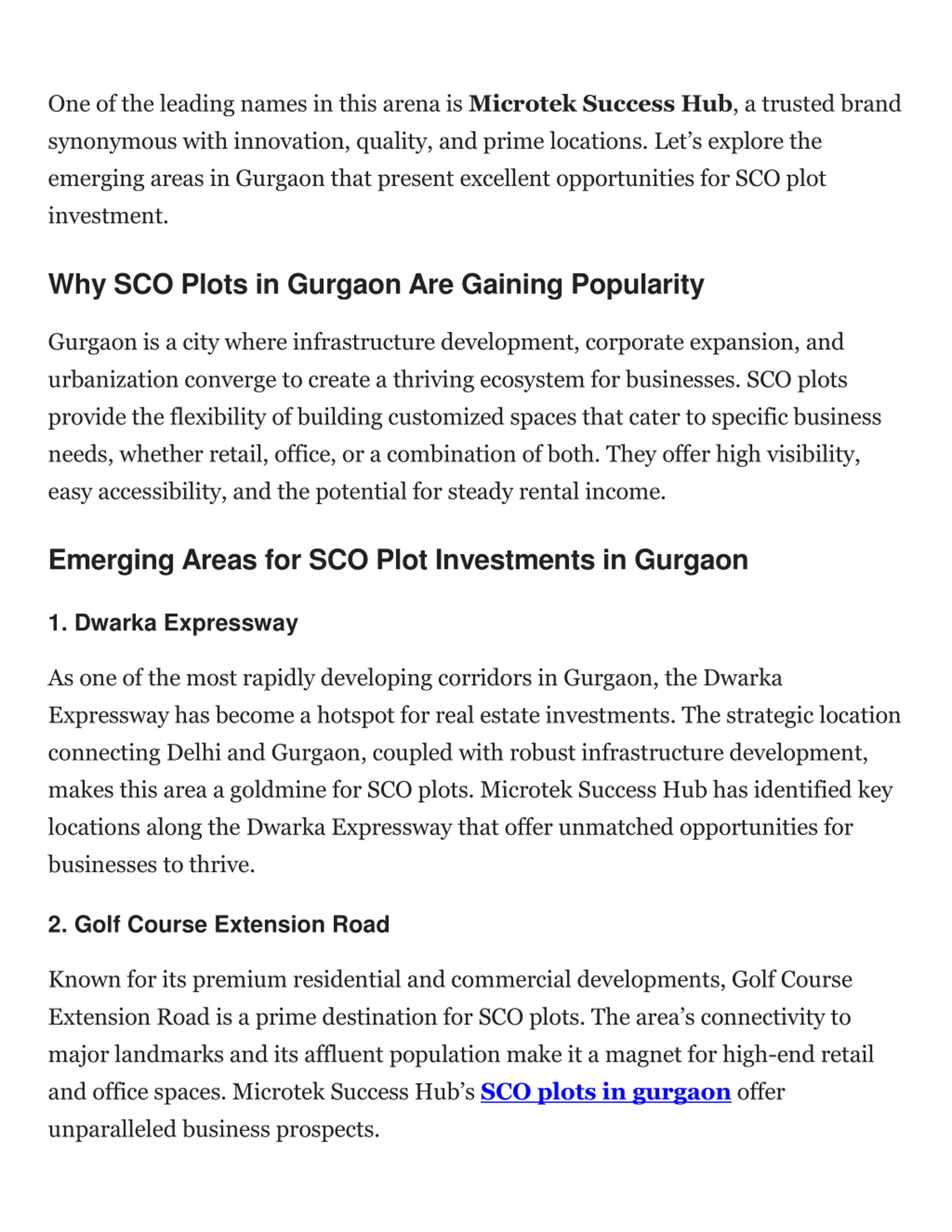One of the leading names in this arena is Microtek Success Hub, a trusted brand synonymous with innovation, quality, and prime locations. Let s explore the emerging areas in Gurgaon that present excellent opportunities for SCO plot investment. Why SCO Plots in Gurgaon Are Gaining Popularity Gurgaon is a city where infrastructure development, corporate expansion, and urbanization converge to create a thriving ecosystem for businesses. SCO plots provide the flexibility of building customized spaces that cater to specific business needs, whether retail, office, or a combination of both. They offer high visibility, easy accessibility, and the potential for steady rental income. Emerging Areas for SCO Plot Investments in Gurgaon 1. Dwarka Expressway As one of the most rapidly developing corridors in Gurgaon, the Dwarka Expressway has become a hotspot for real estate investments. The strategic location connecting Delhi and Gurgaon, coupled with robust infrastructure development, makes this area a goldmine for SCO plots. Microtek Success Hub has identified key locations along the Dwarka Expressway that offer unmatched opportunities for businesses to thrive. 2. Golf Course Extension Road Known for its premium residential and commercial developments, Golf Course Extension Road is a prime destination for SCO plots. The area s connectivity to major landmarks and its affluent population make it a magnet for high-end retail and office spaces. Microtek Success Hub sSCO plots in gurgaon offer unparalleled business prospects.