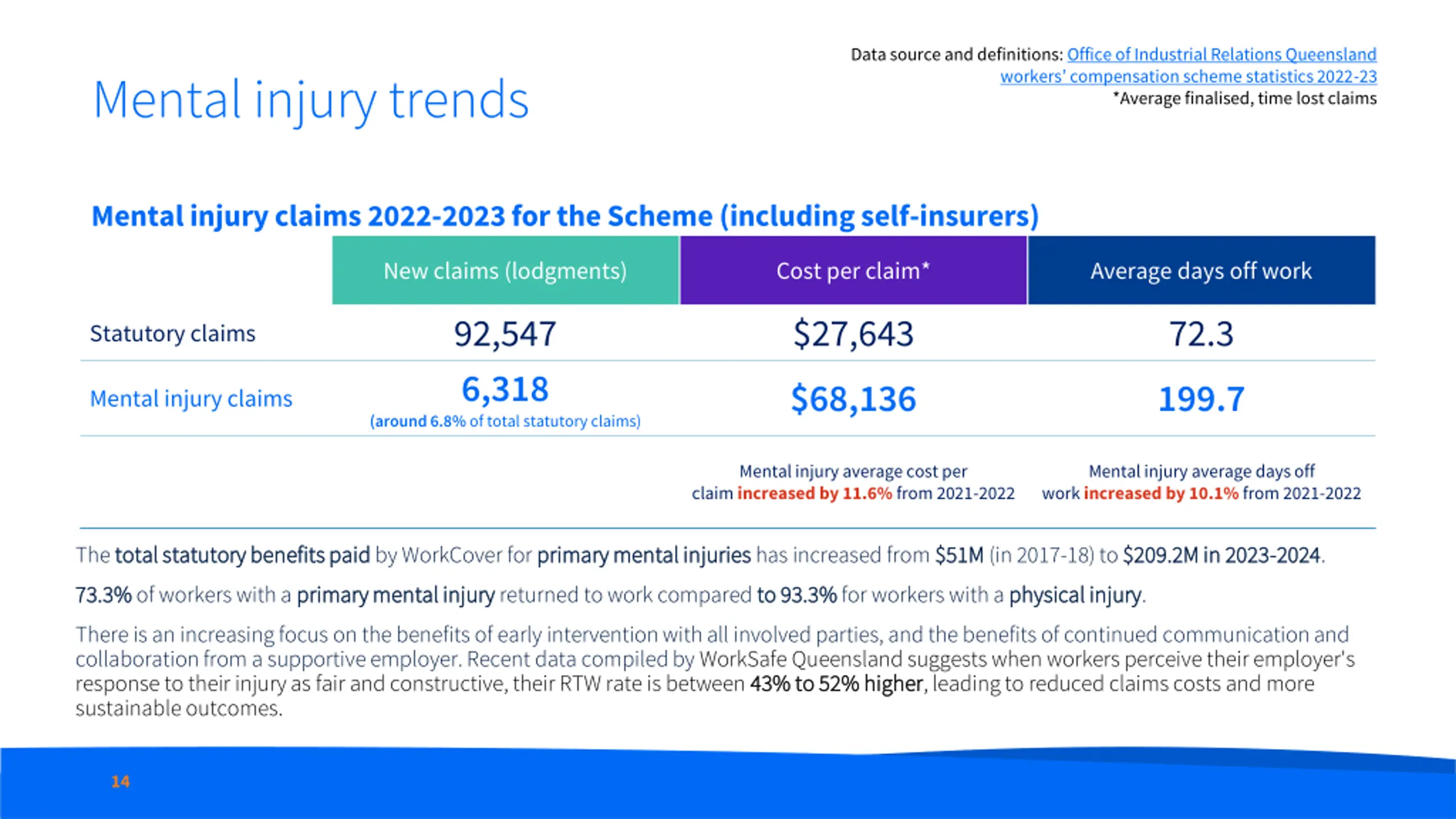 Data source and definitions: Office of Industrial Relations Queensland workers compensation scheme statistics 2022-23 *Average finalised, time lost claims Mental injury trends Mental injury claims 2022-2023 for the Scheme (including self-insurers) New claims (lodgments) Cost per claim* Average days off work 92,547 6,318 $27,643 $68,136 72.3 199.7 Statutory claims Mental injury claims (around 6.8% of total statutory claims) Mental injury average cost per claimincreased by 11.6% from 2021-2022 Mental injury average days off workincreased by 10.1% from 2021-2022 The total statutory benefits paid total statutory benefits paid by WorkCover for primary mental injuries 73.3% 73.3% of workers with a primary mental injury primary mental injury returned to work compared to 93.3% There is an increasing focus on the benefits of early intervention with all involved parties, and the benefits of continued communication and collaboration from a supportive employer. Recent data compiled by WorkSafe Queensland suggests when workers perceive their employer's response to their injury as fair and constructive, their RTW rate is between 43% to 52% higher sustainable outcomes. primary mental injuries has increased from $51M to 93.3% for workers with a physical injury $51M (in 2017-18) to $209.2M in 2023 physical injury. $209.2M in 2023- -2024 2024. 43% to 52% higher, leading to reduced claims costs and more 14